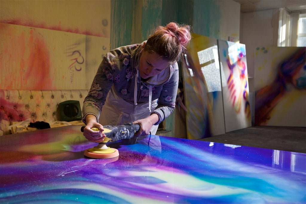 The work is gloss aluminium with airbrush and spray guns with some metallic and sparkling paints which shimmer and shift. The painting is taken from a photographic section of an Amphiron Ocelaris fish which I took diving in the Red Sea.