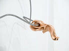 There is a wall fitting that needs a deep wall plug and s crew in order to screw a disc on the wall. Then the disc has two side holes, where there are two threaded inserts with an allen key head that need to be screwed in. This is for the neck of the piece. The bow like structure is inserted with a bolt into a threaded insert and tightened with a screw. The side arms have one bolt each that tightens with a nut. The copper piece needs to bee handled with gloves at all times as it will oxidise otherwise. There are two holes on the piece where the arms slot in.