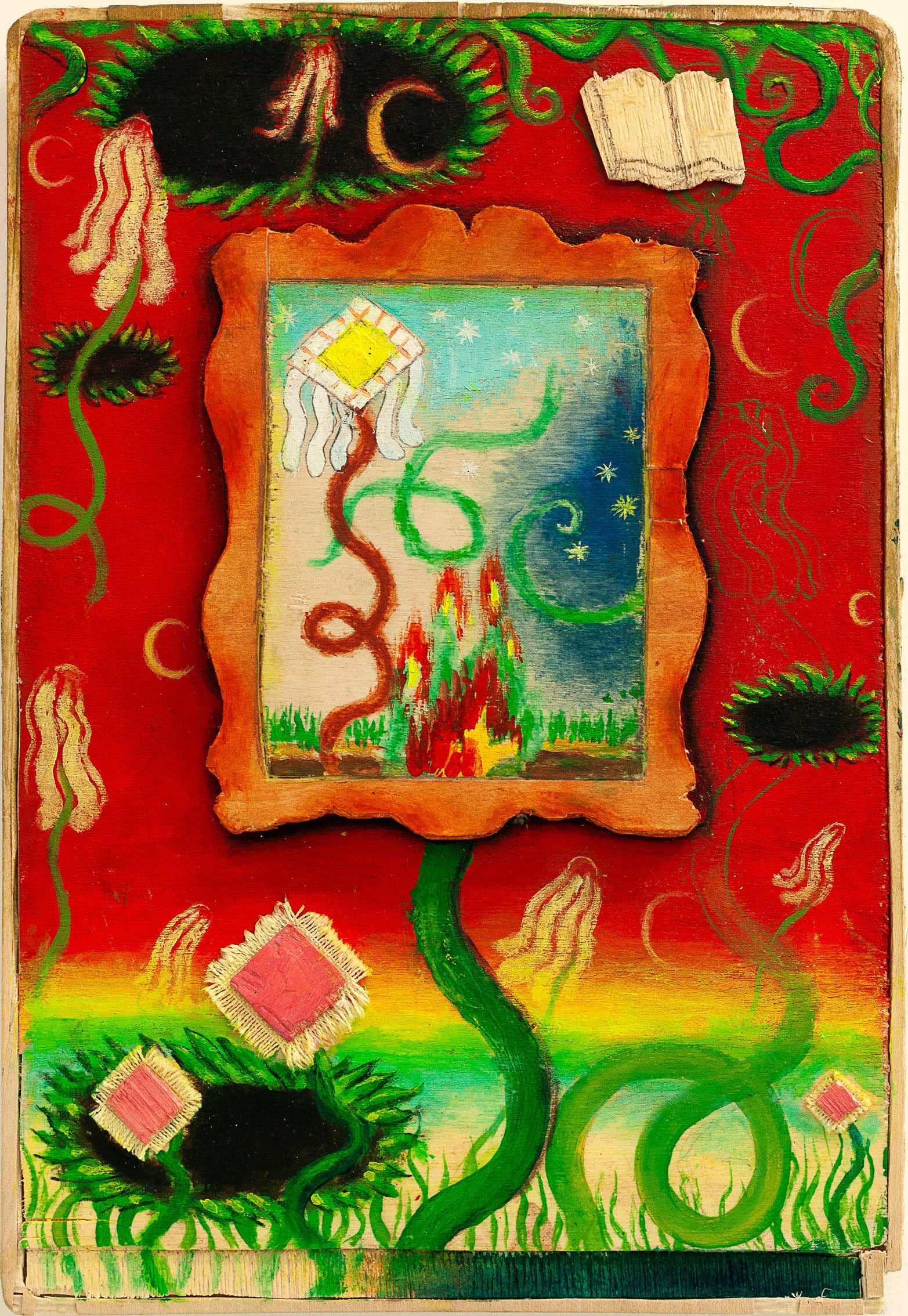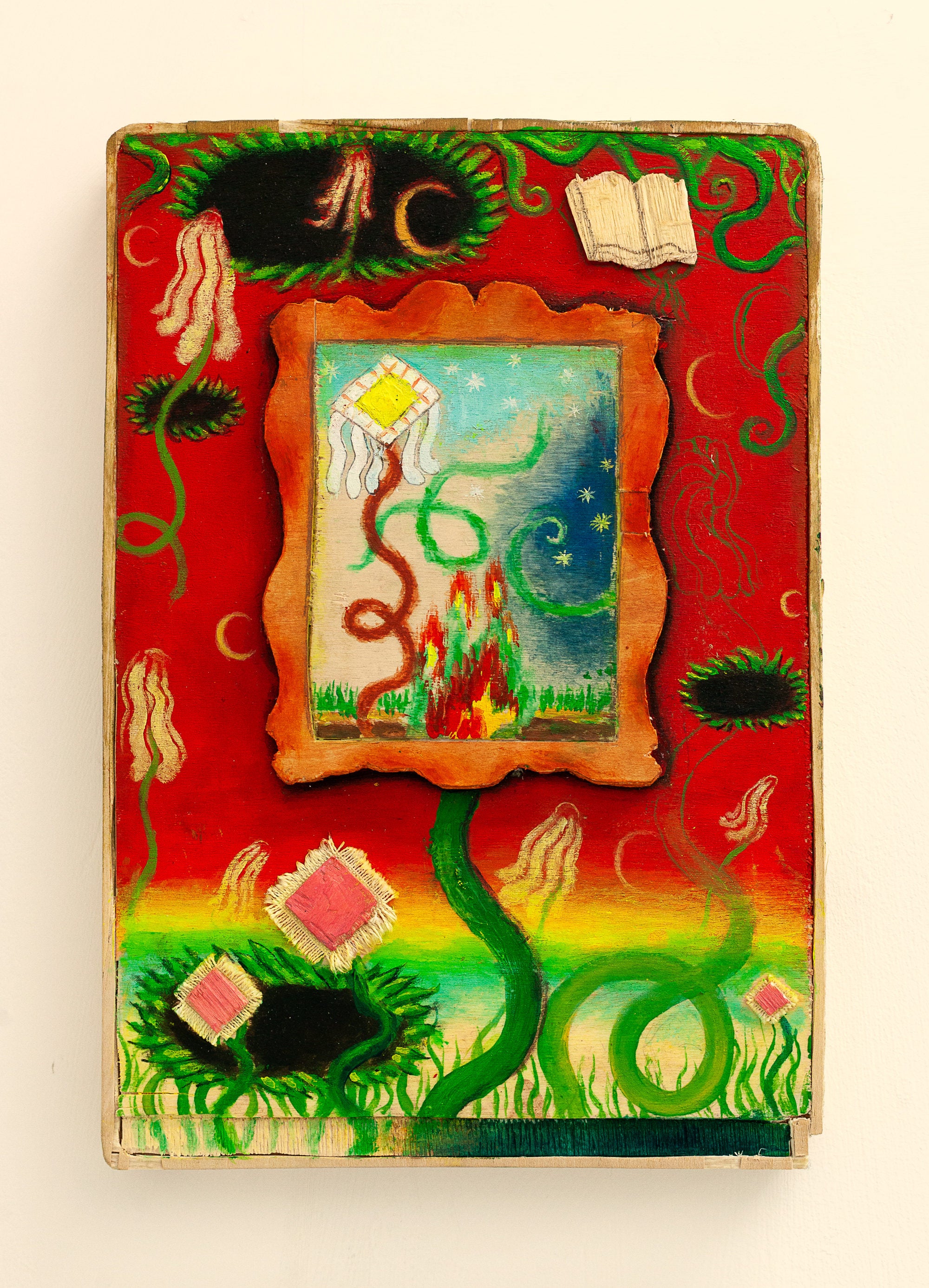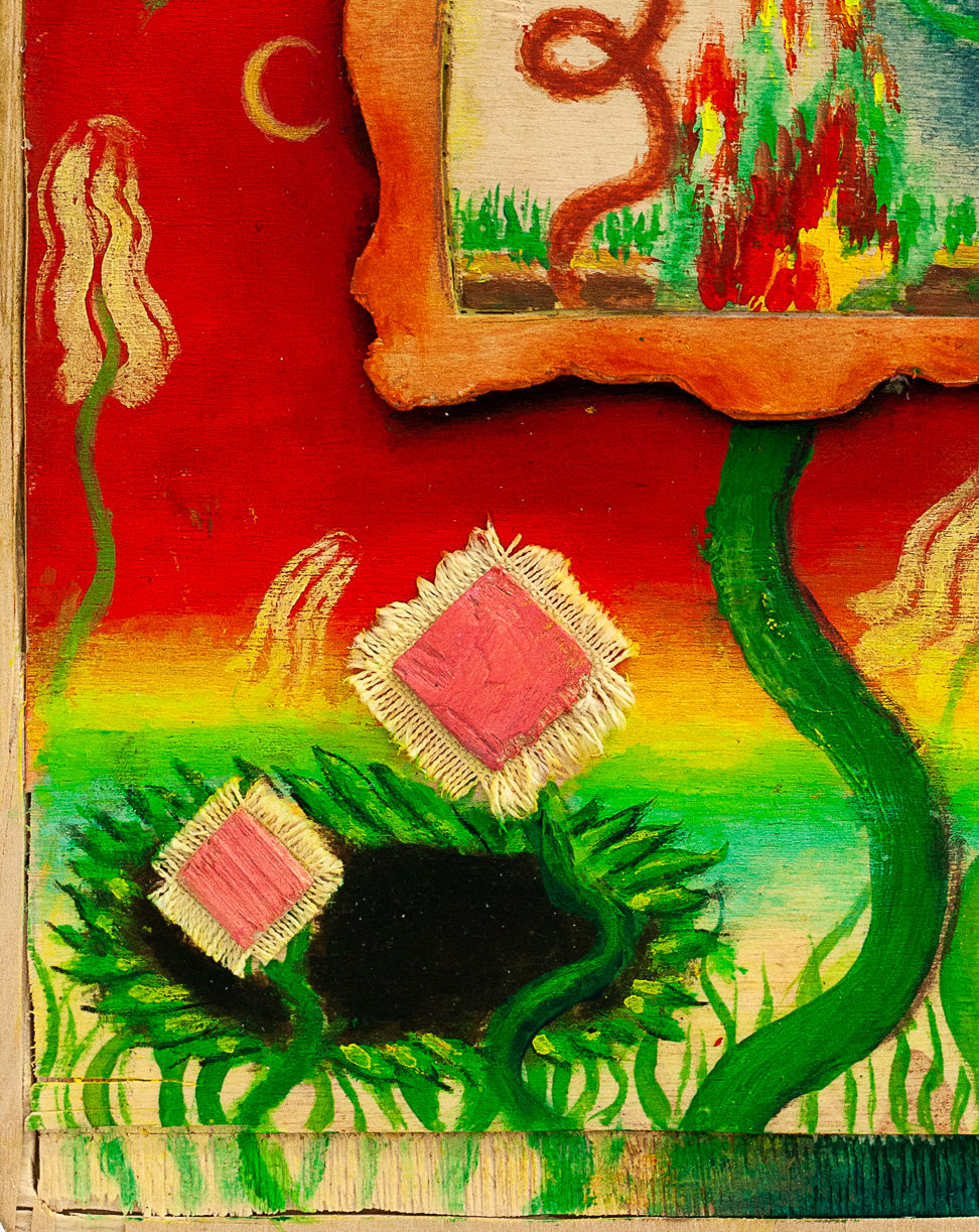 ‘Daisy Sees Red’ is built by hand out of plywood and studio offcuts, seeing certain raised elements and a delicate raw wooden edge. The intuitive, abstracted process of distilling personal and ambiguous imagery results in a gamified viewpoint. Whilst the view is formal, head-on and flattened, there is a slipping and sliding of potential realities; a landscape, a window or mirror, a pattern. The tension that lies beneath the surface hints at a the desire to break out; geometricised flora, along with a sense of rotating time, feel both joyful and pathologically embodying a breaking point.