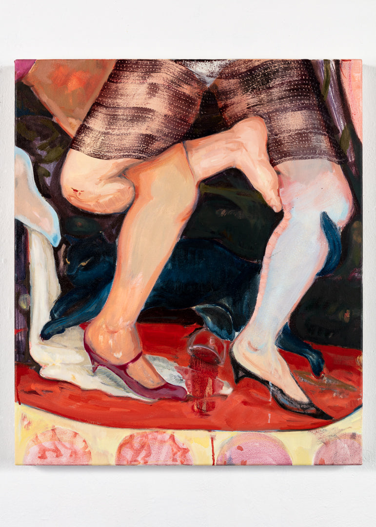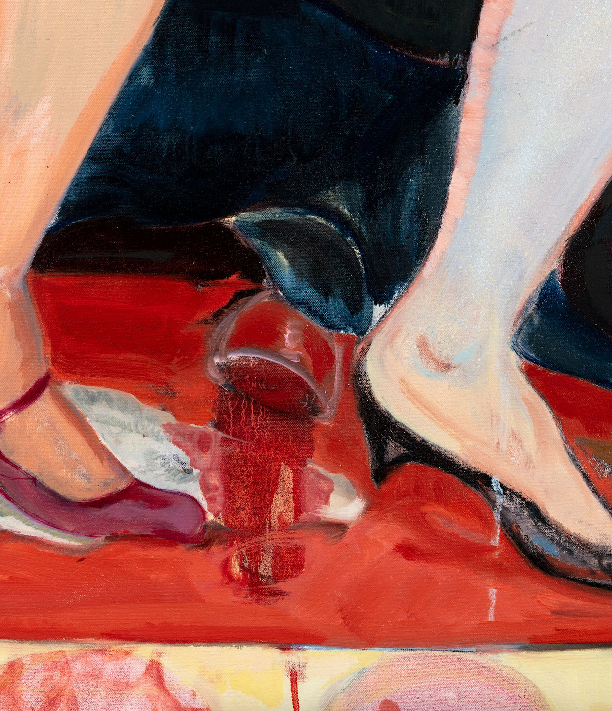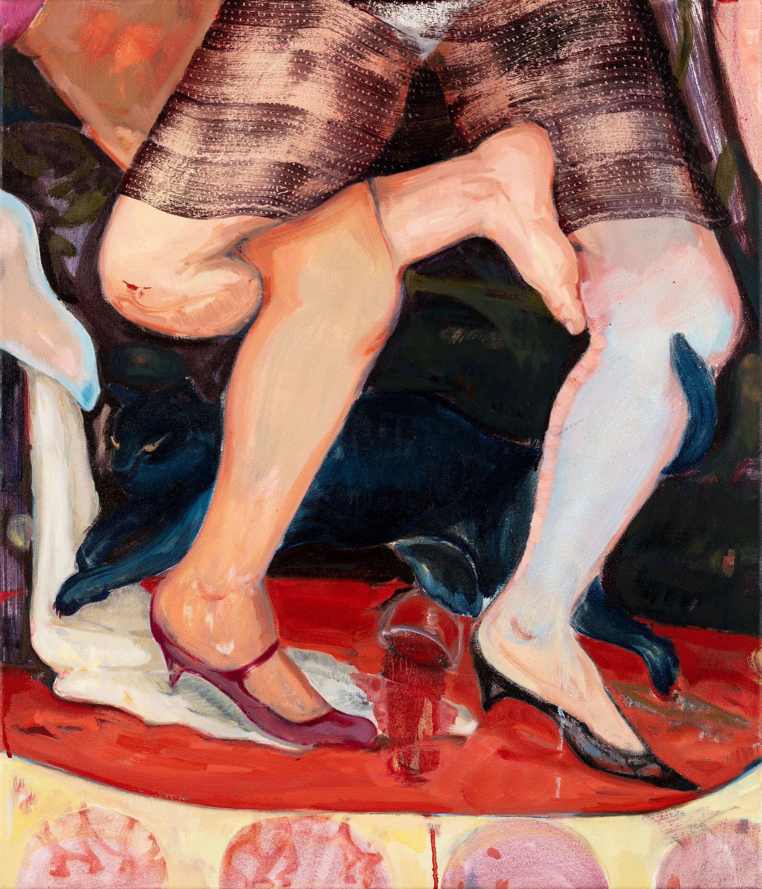 An intimate tangle of legs, stockings, and high heels. choreographed and chaotic, the figures are cut, composed tightly at the thighs, their interaction focused entirely on the language of legs: bruised, scraped, flexed. They both have an edge between closeness and entrapment. A glass lies spilled on the red floor, hinting at aftermath or interruption. Beneath them, a dark feline presence jumps through the legs, aware of the audience and our gaze.