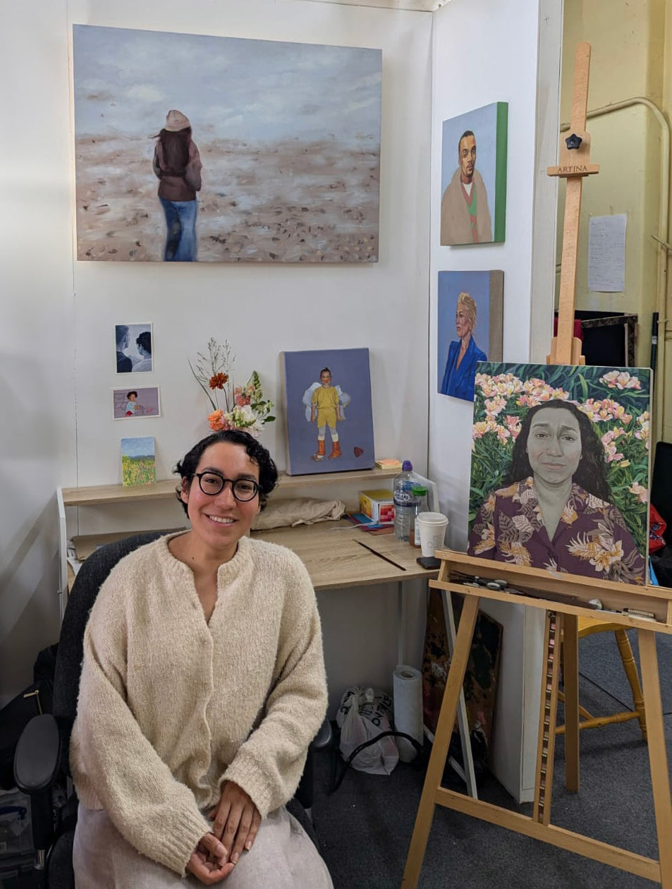 In this work, I depict myself embodying how I wanted to feel at the time. During a period when I felt deeply disempowered, I painted myself resilient, with a wide stance and hands crossed, facing the viewer. The style of the garment I am wearing is reminiscent of tondero and festejo attire, two types of Peruvian folk music, tondero having originated in my home city of Piura. I view this work as an effort to ground myself by referencing empowering body language and colour and drawing on my heritage. This painting appeared on Portrait Artist of the Year, Series 11.