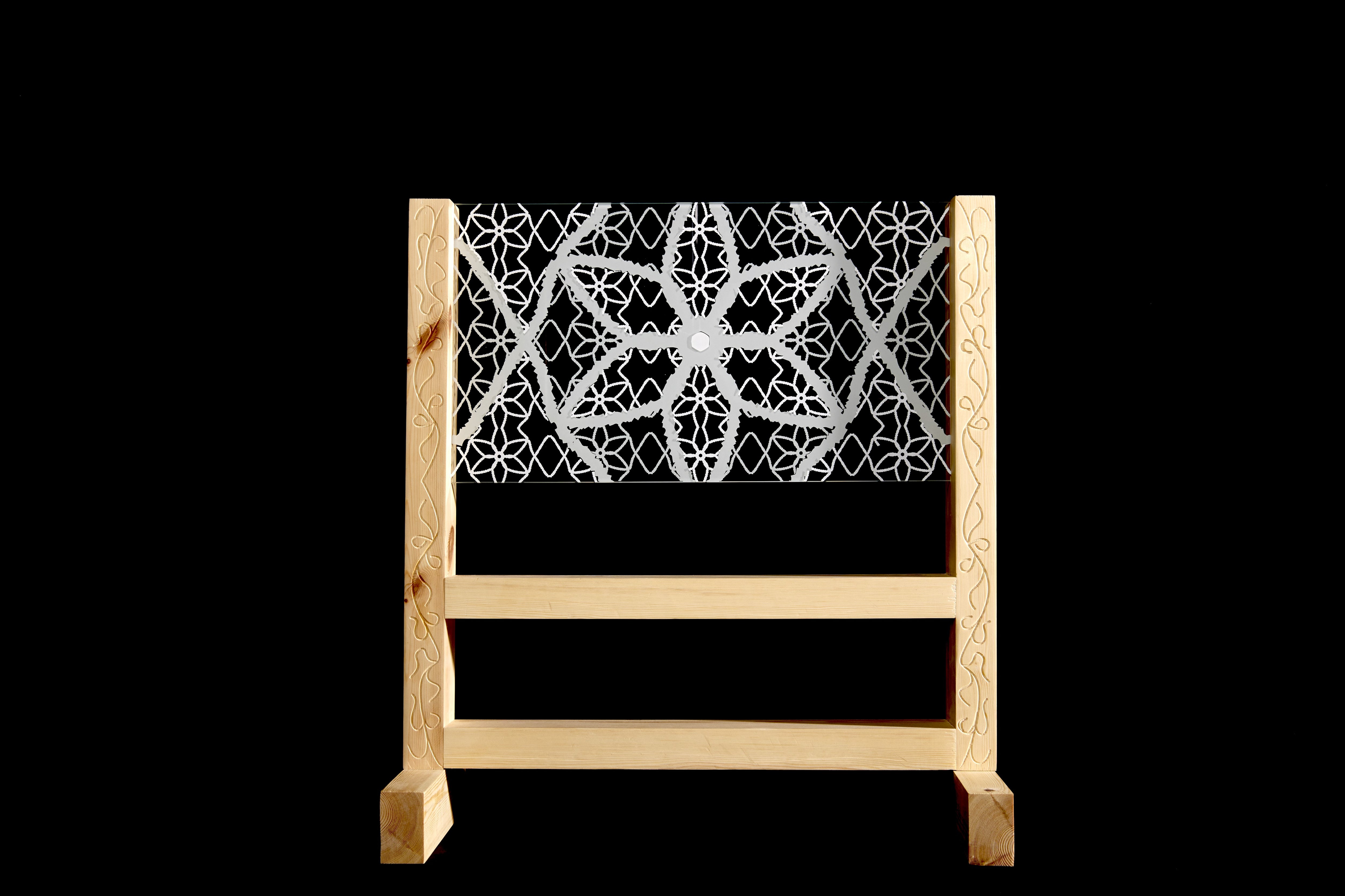 Mine Mask, Thy Frame' is a sculptural work exploring transformation, vulnerability, and emotional defense. A delicate, diaphanous mask is double UV-printed onto glass, evoking the fragile evolution of a white rose. Its thorns and further-developed patterns are CNC-engraved into a wooden frame, uniting protection and exposure. The glass acts as both shield and screen—inviting yet distancing—while the mask symbolizes the emotional veneers we wear. Blending digital fabrication with tactile materiality, the piece invites reflection on what we choose to hide or reveal, and how concealment shapes identity.