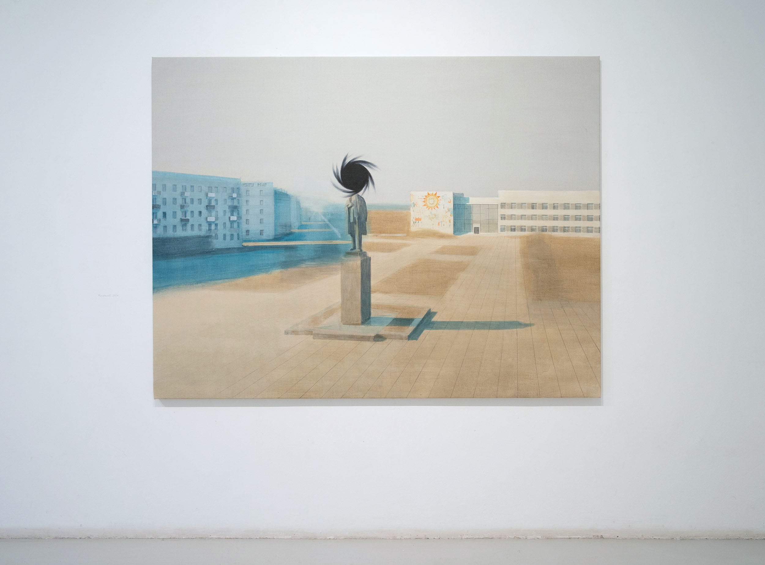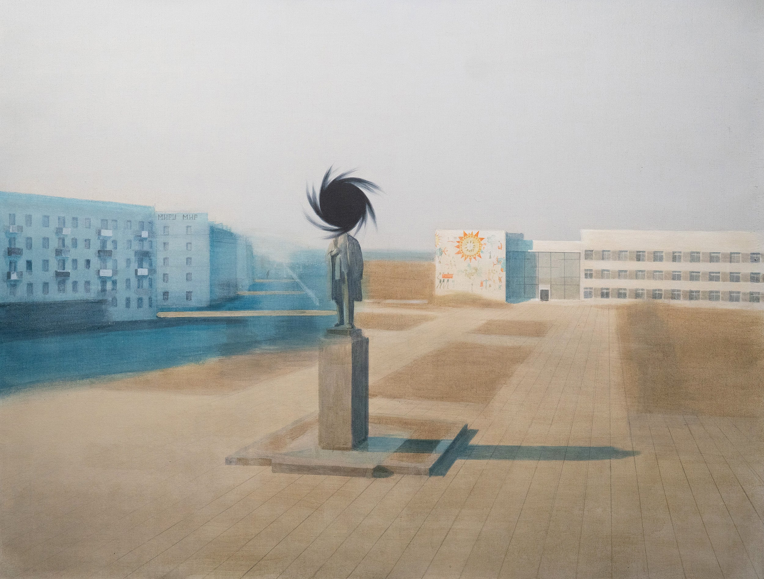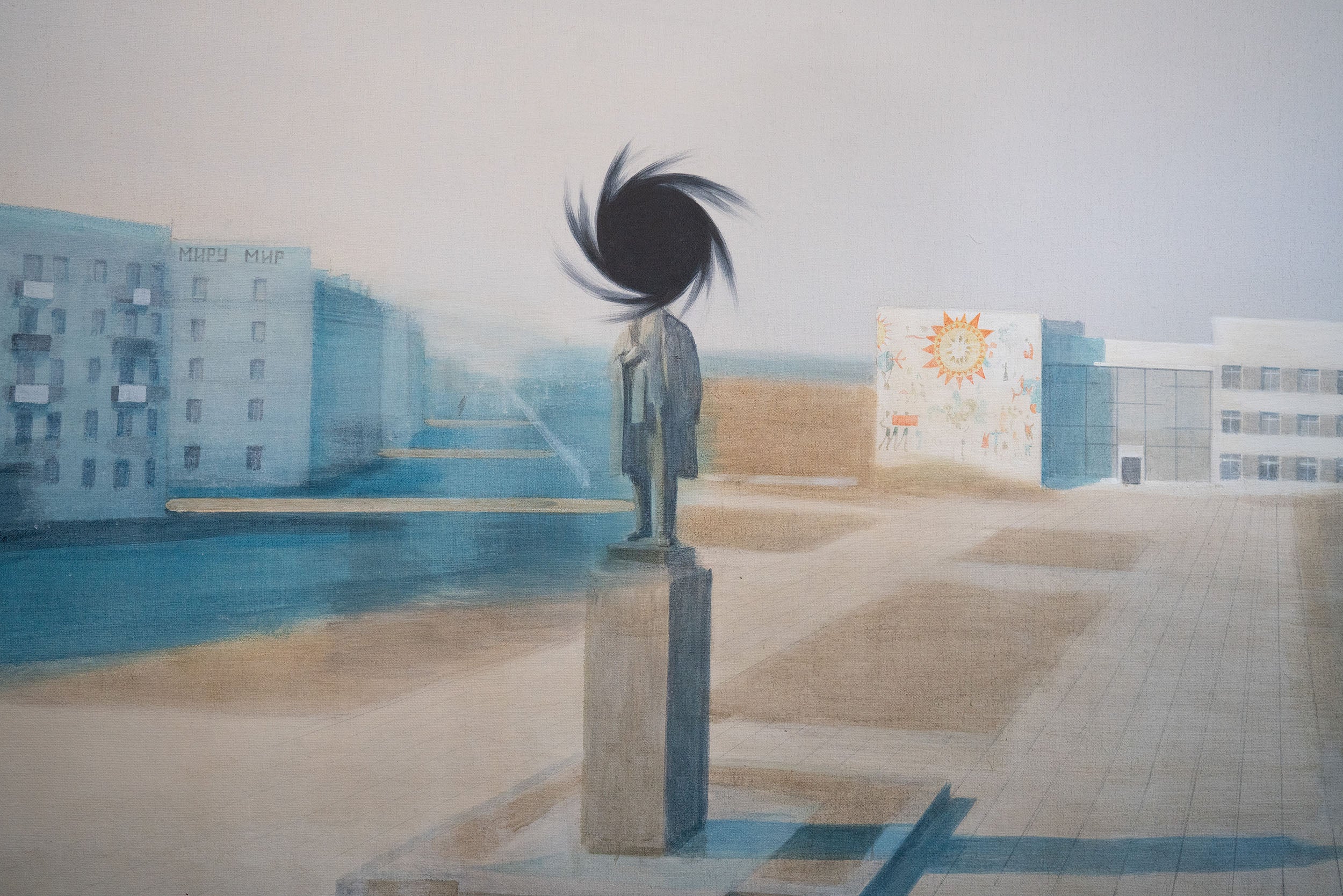 This painting shows Lenin Square in my hometown, Dzerzhinsk, with the Palace of Pioneers behind it. I spent years in its clubs — especially Astronomy — where we pointed telescopes skyward but ended up staring at Lenin's bird-stained head. Monuments like his were everywhere: in textbooks, on classroom walls, in street names. Only later did I learn about the Red Terror he unleashed. The “kind” Lenin, with his creased eyes, was in fact brutal. I turned his head into a black vortex. His monuments don’t honour socialism — they mark a system that demanded, and still demands, human sacrifice.
