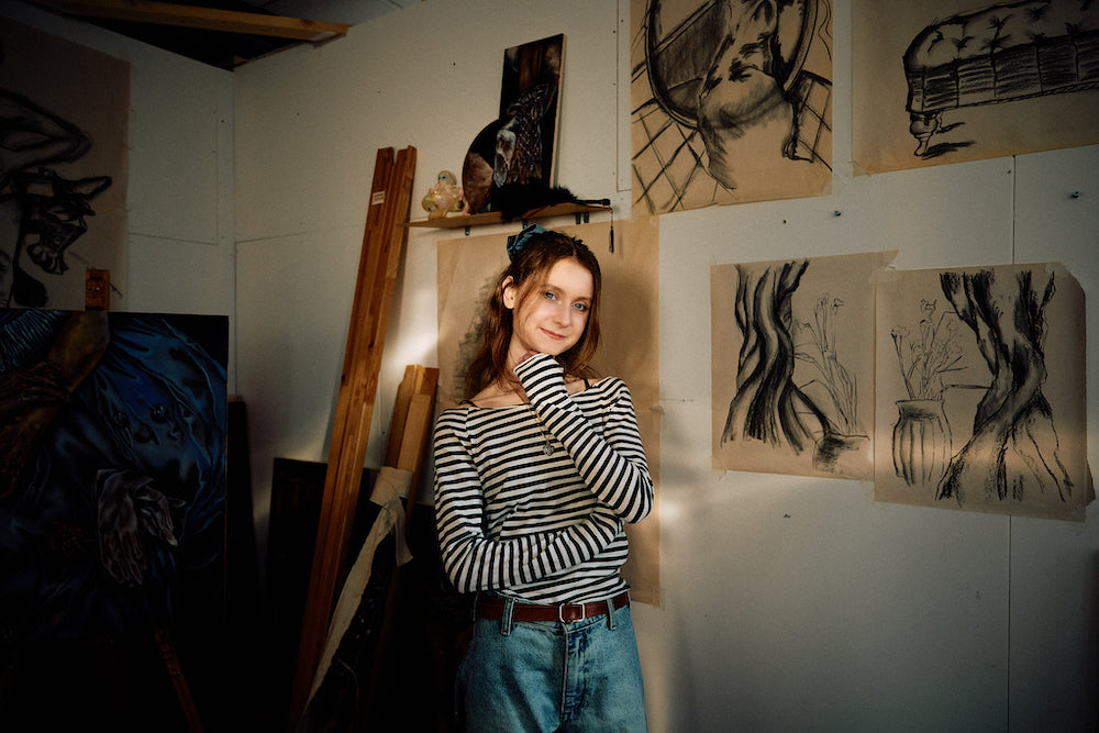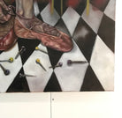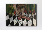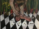 Exploring the fascinating costumes and accessories of the ballet, the whimsical isolated scene is cropped to where the person's arms and legs are visible, and their hands are manipulating the laces of glossy pink ballet shows. Celebrating the grace and glamour of quotidian acts, there is an emphasising of features using stage aesthetics. Drama and intrigue is heightened as several straight pins with yellow and purple heads are scattered around the shoes, the title referring also to the condition of paresthesia, subtly implying that chilling, numb, and tingling realities writhe beneath the surface level stage glow.