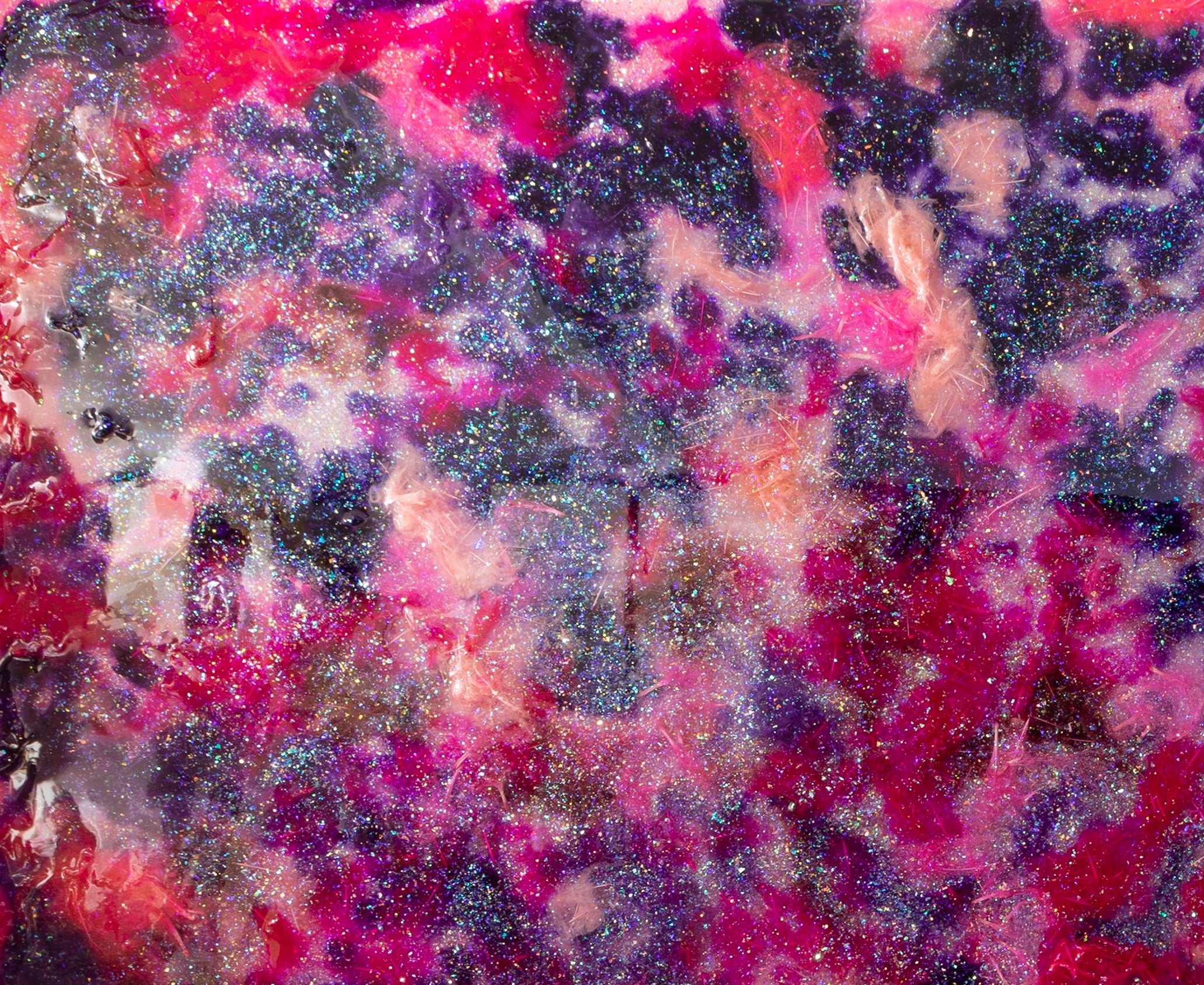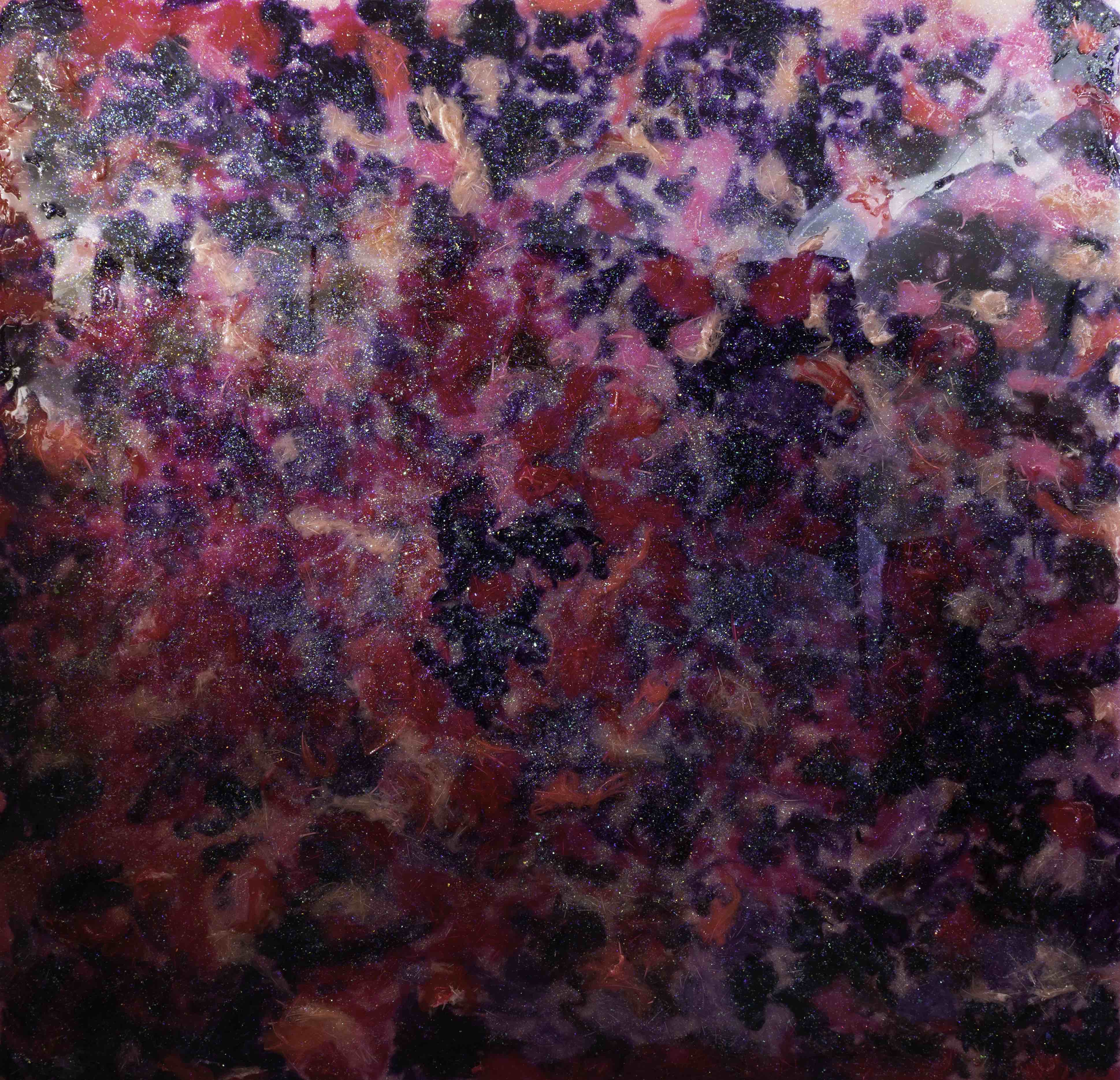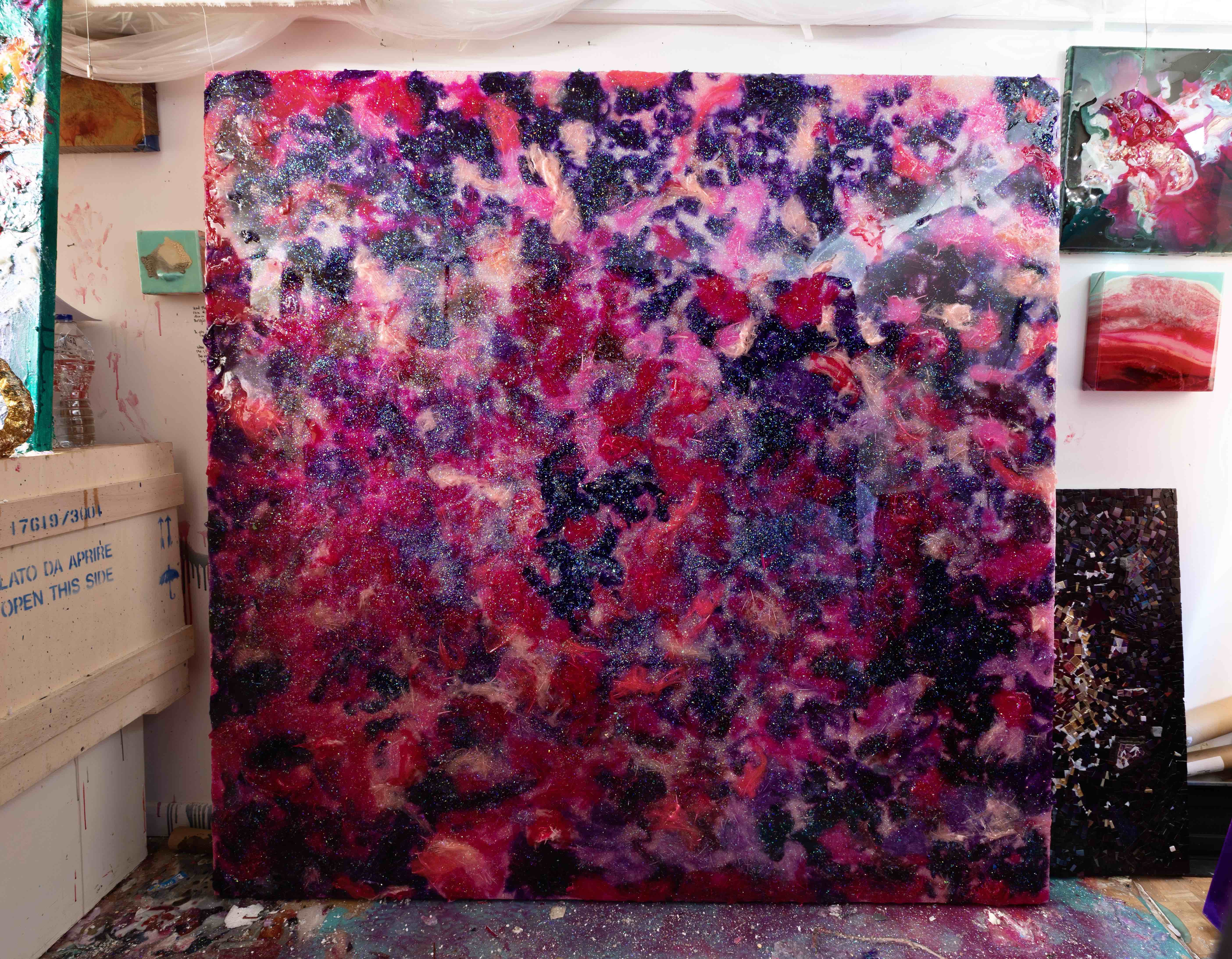 This mixed media sculptural painting uses hand-dyed synthetic feathers to create a richly textured, vibrant surface. Dominated by intense reds, magentas, purples, and blacks, the composition evokes a sense of fiery energy and cosmic movement. The feathers and layered materials give the piece a three-dimensional, tactile quality, blurring the line between painting and sculpture. Glittering elements catch the light, adding a dynamic, shimmering effect. Visually bold and materially lush, the work explores themes of transformation and beauty through abstraction, combining softness with intensity in a striking and immersive form that invites close inspection and emotional response.