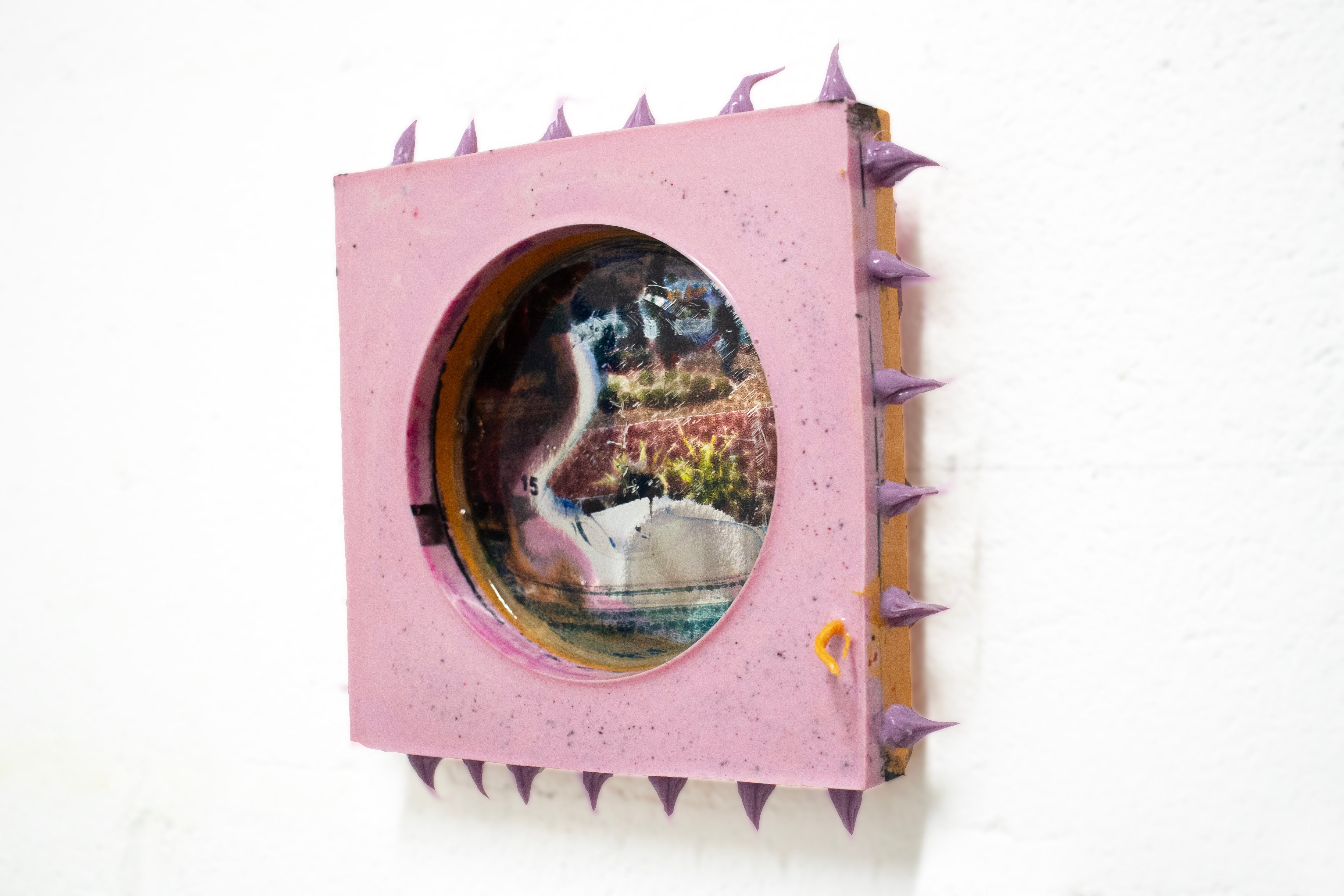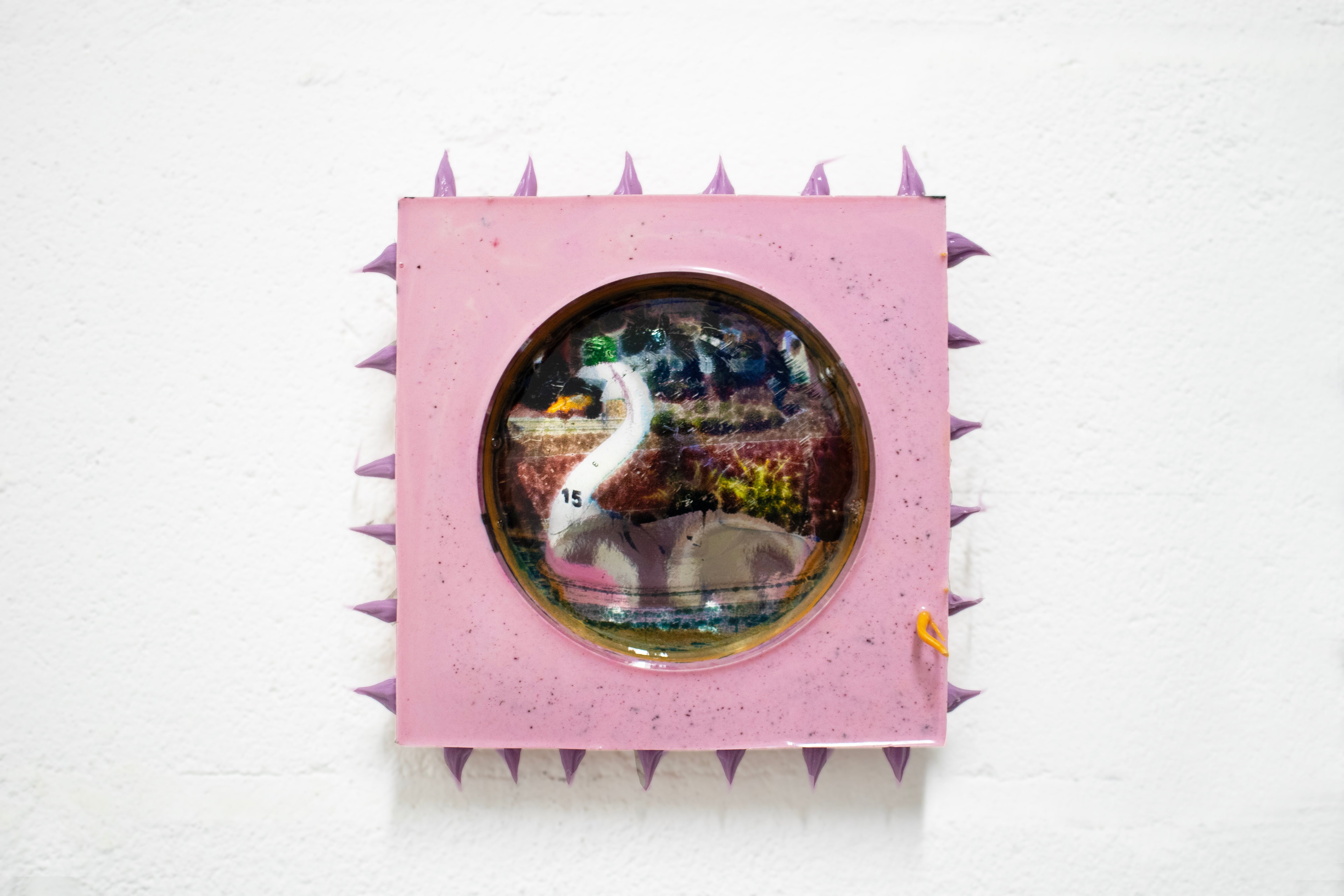 This artwork, created in 2025, depicts swan push boats in Bangor, a fond childhood memory of mine was visiting here every summer. Made from resin, silicone, plaster, and an inkjet print, it features the number 15 marking the artist's birthday and lucky number. The piece is layered with nostalgia and physical materiality. A soft mirrored background introduces a self-reflection, inviting the viewer to engage with the image as both scene and surface.