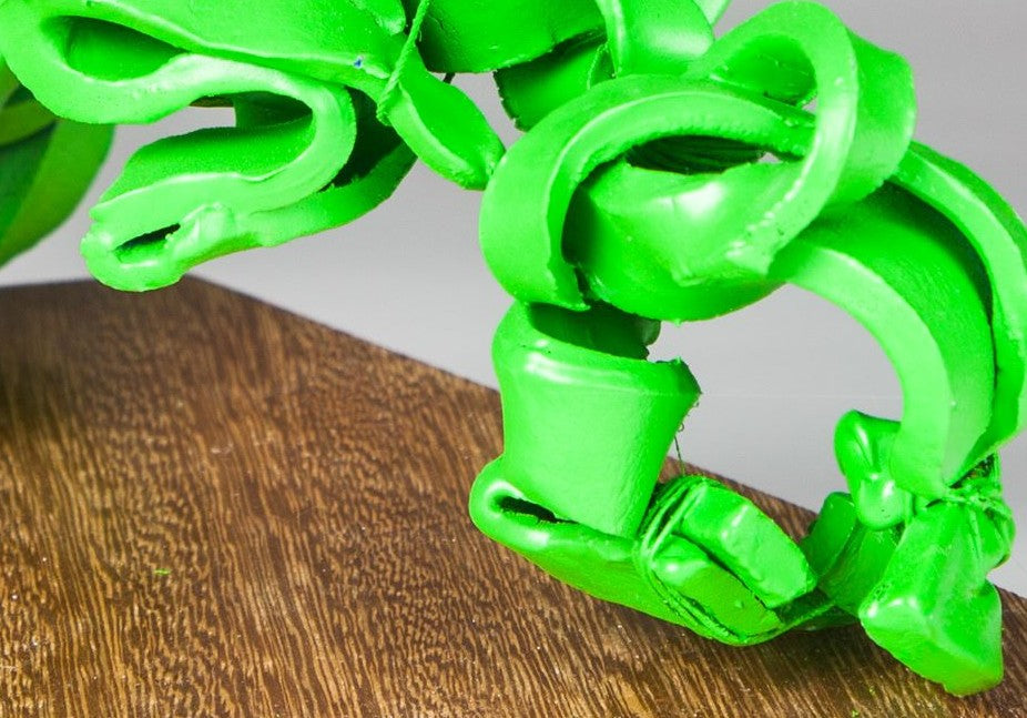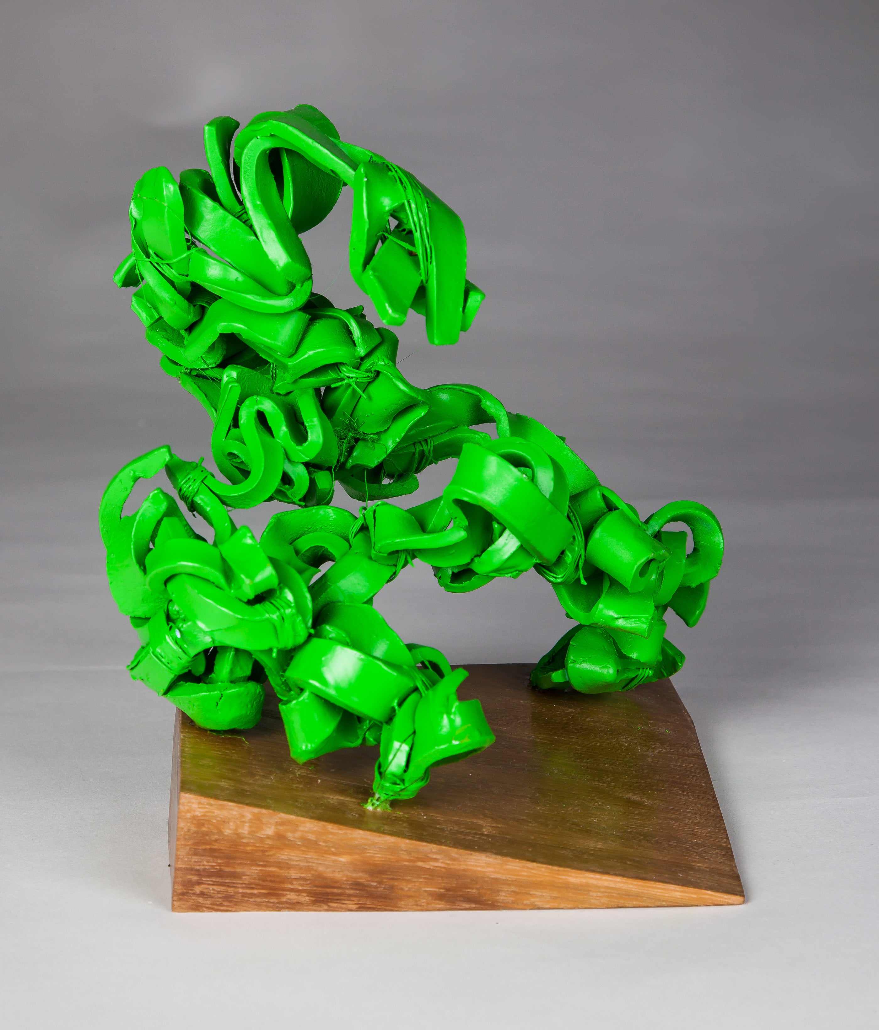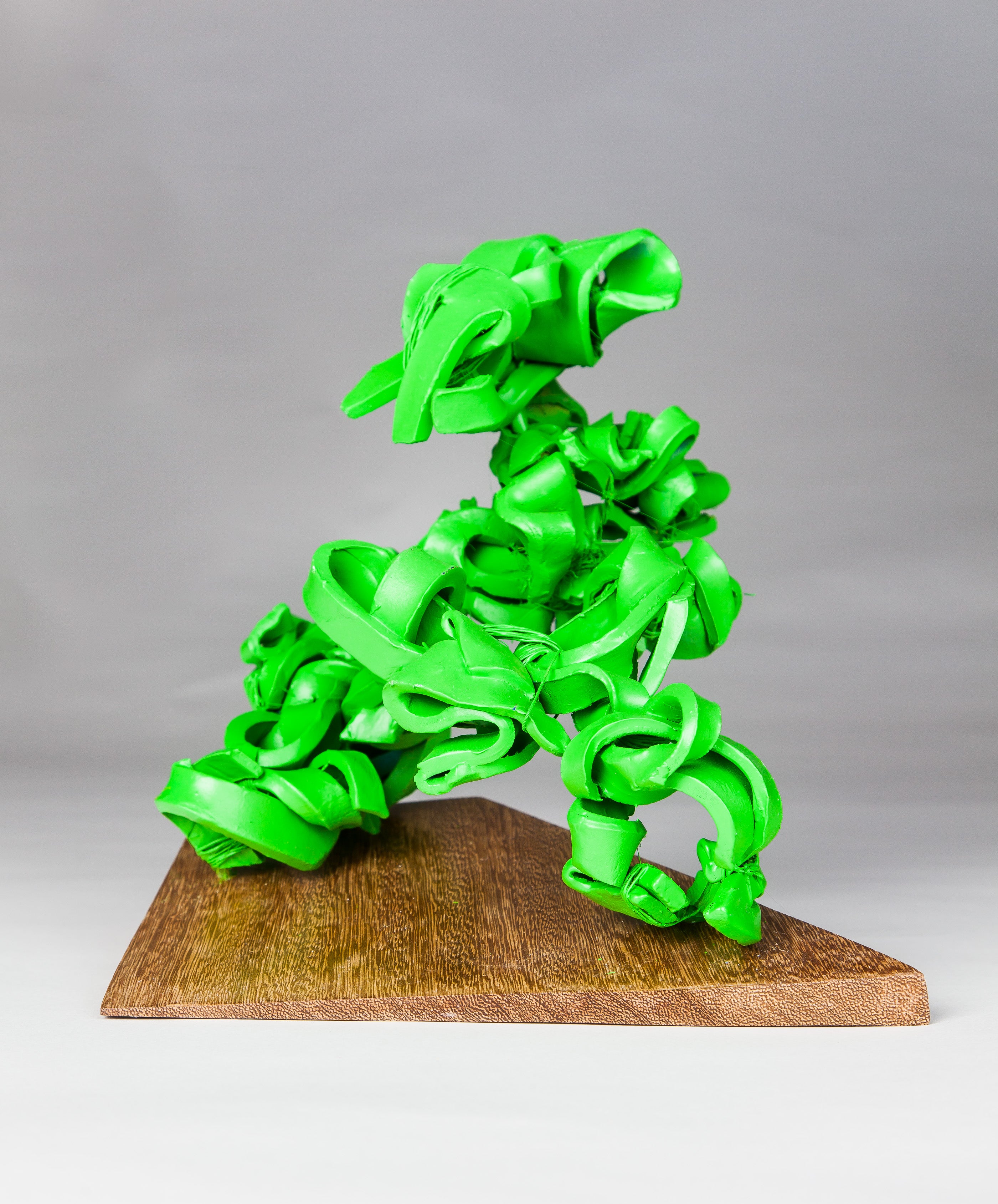 Slim lengths of slim wood have been cut and reconfigured in a way that propels movement and creating an energetic rhythmic interplay between solid form and void. The wood is stapled together with the metal fastenings acting not merely as connectors but as subtle directional cues. These metallic points catch the eye and guide the gaze through the sculpture inviting a visual choreography. There is a tension between the rawness of the construction and the fluidity of the lines—a physical drawing in three dimensions.
