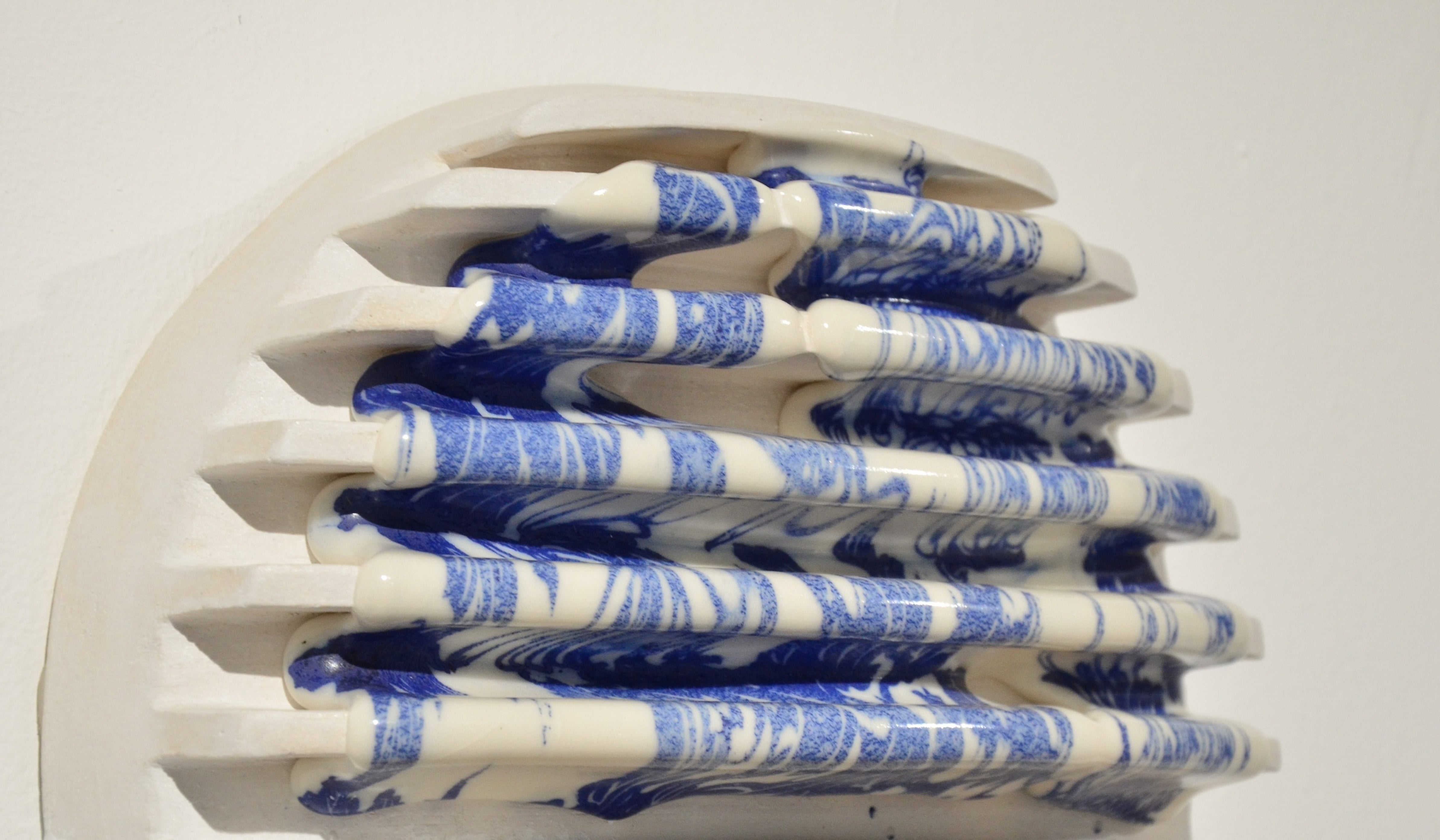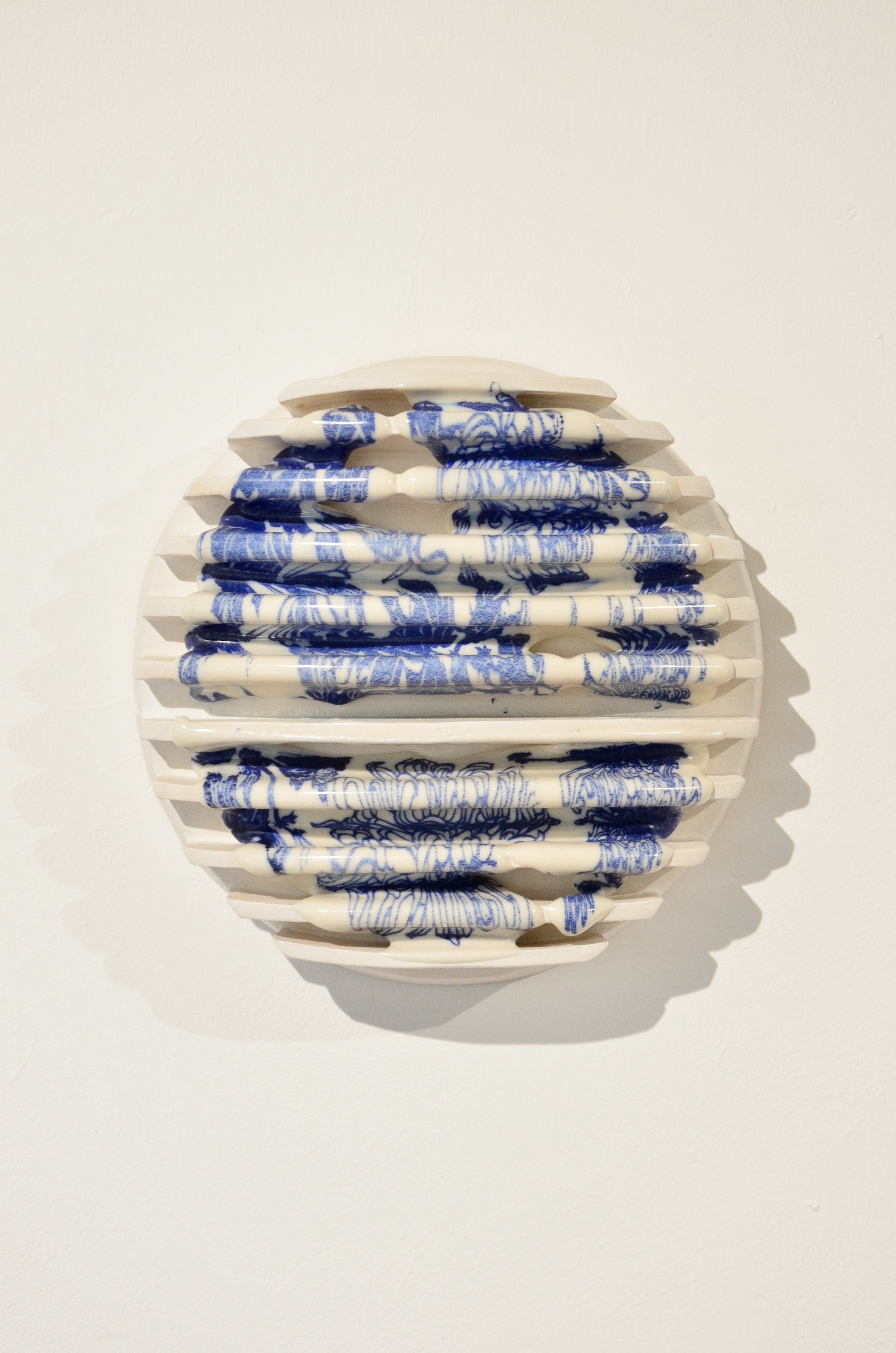 Re-print is a series exploring how ceramic surfaces preserve and obscure storytelling. Using a glaze-printing method developed during her MA at the Royal College of Art, Helena Lacy layers and reinterprets classical blue and white porcelain imagery, using its familiarity, and questioning how visual histories are retold. The work reflects her interest in hidden narratives and how memory and place are embedded in all objects. Through the distortion of image - created by repetition and fluid movement, the series invites reflection on memory and the quiet power of material storytelling.