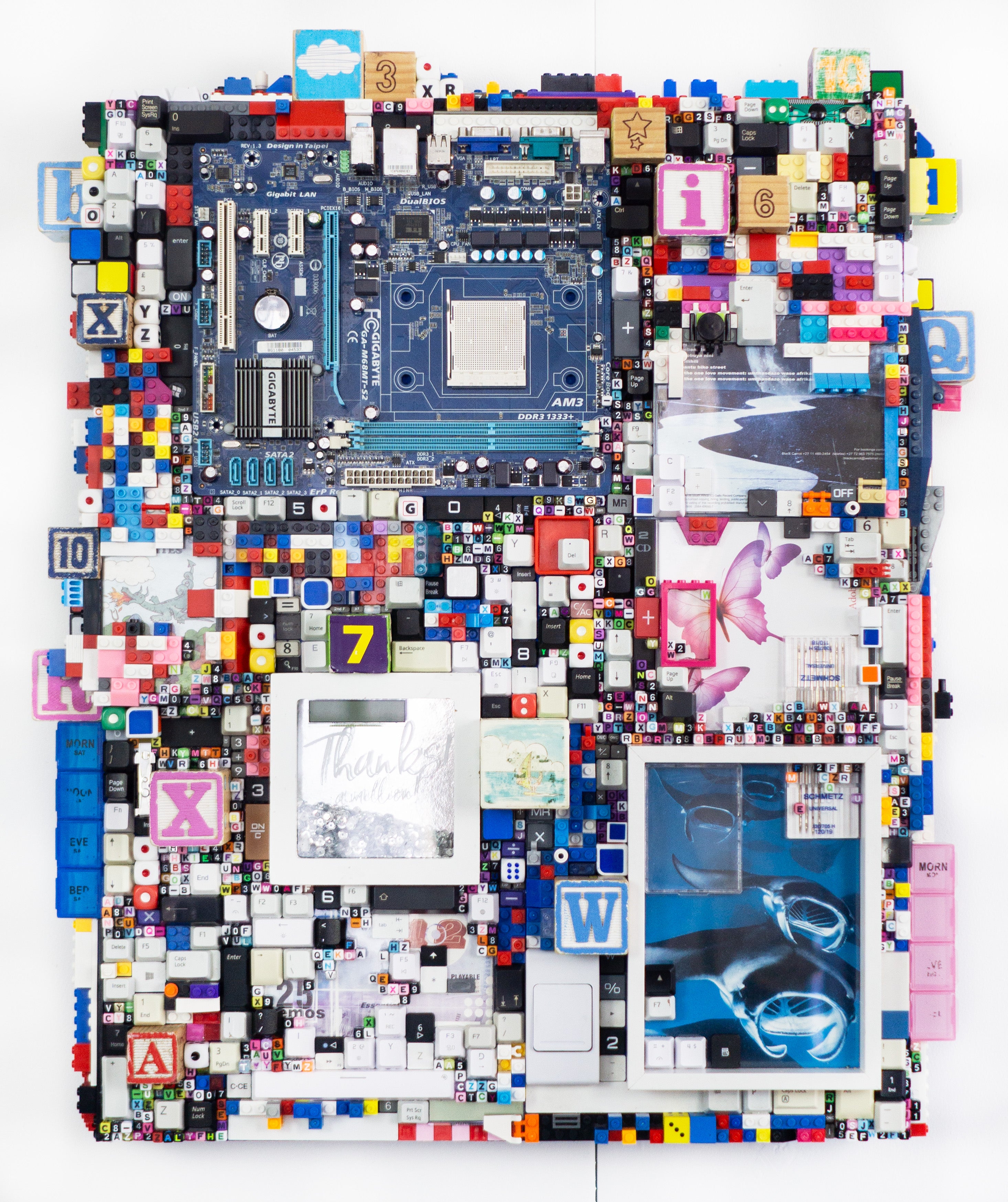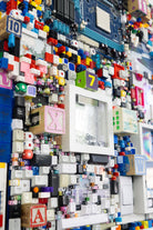Made from a collection of mostly found objects and assembled into a dense, vibrant grid, infusing a nostalgia for a simpler time in digital culture into a satisfyingly overwhelming composition.