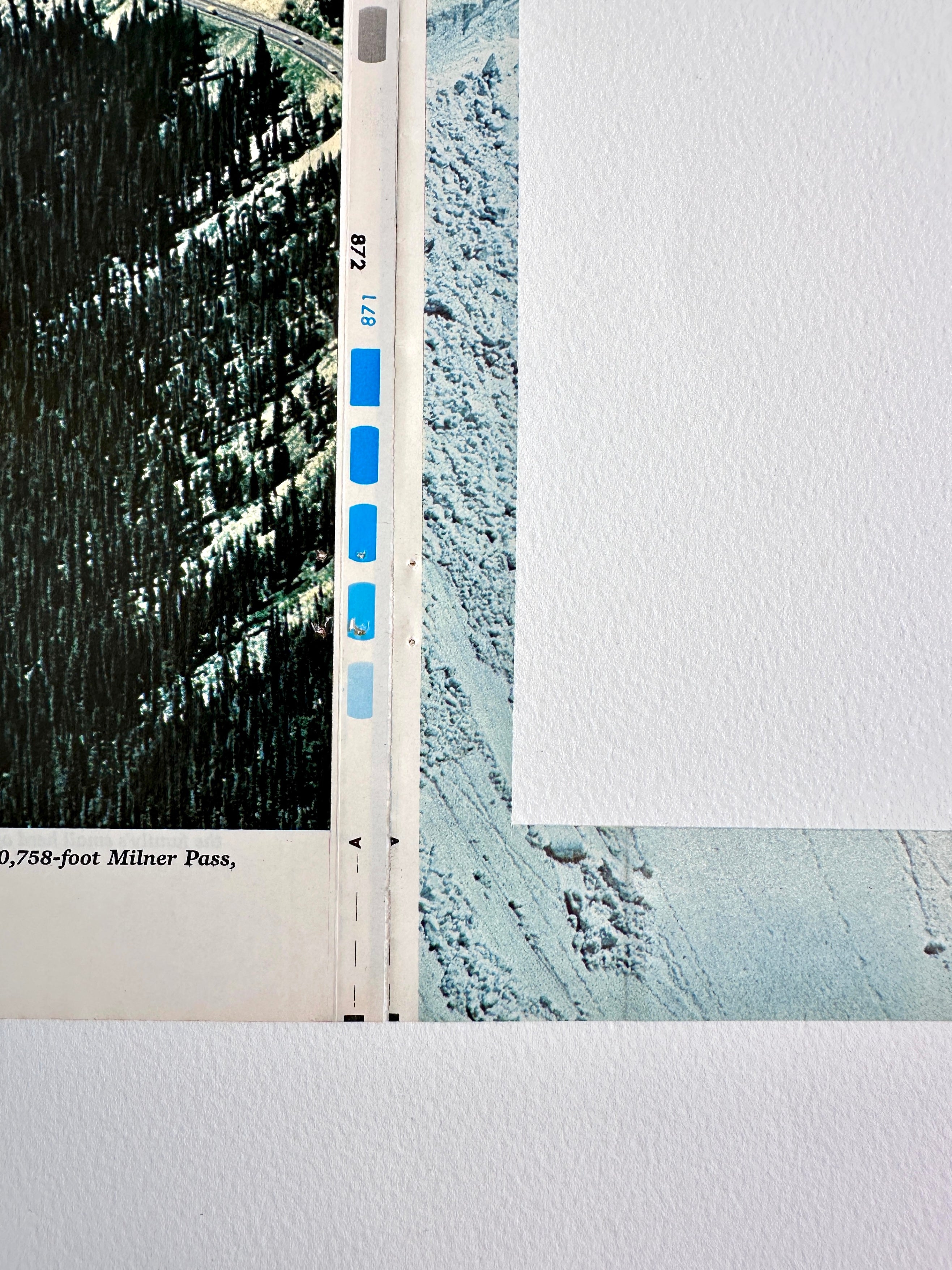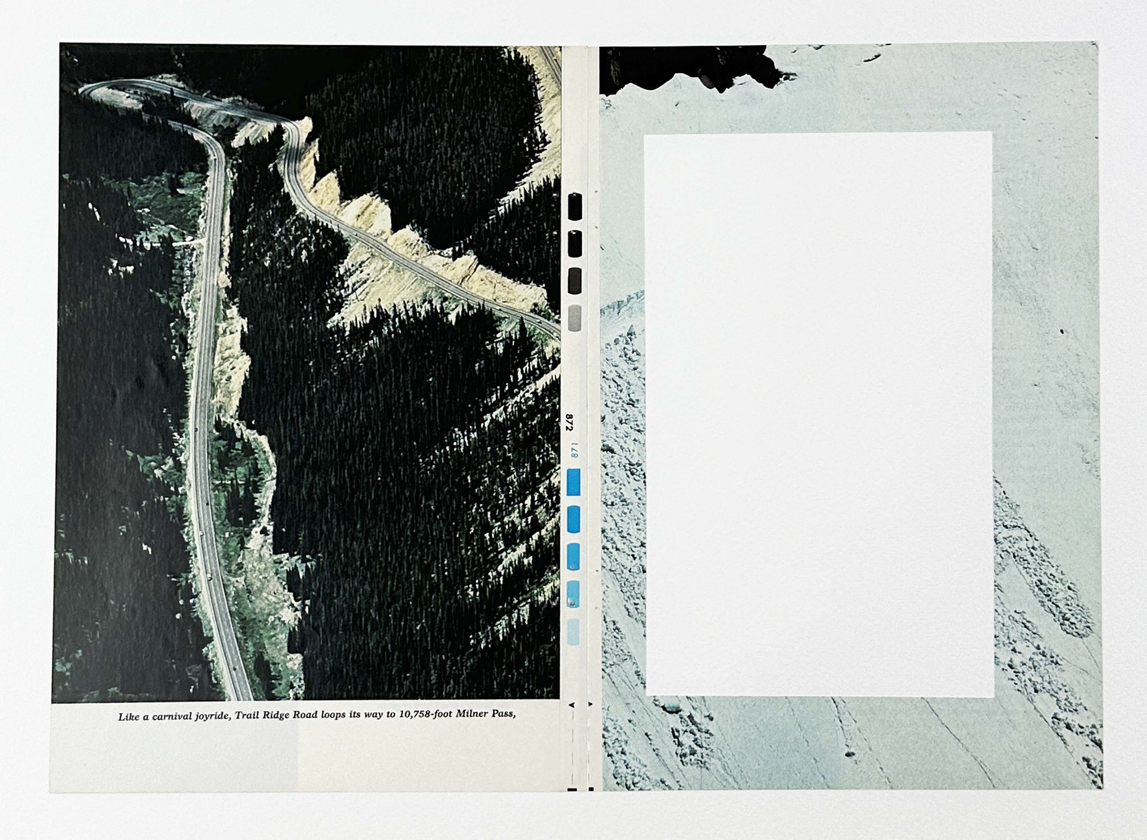1 of a series of collages reflecting on both real and metaphorical journeys, depicting trackways, paths, trails, and tracks. Entire sections are deliberately removed, obliterating essential information and exposing the underlying structure of the magazine in which they appear, raising questions about how we disseminate information and knowledge.