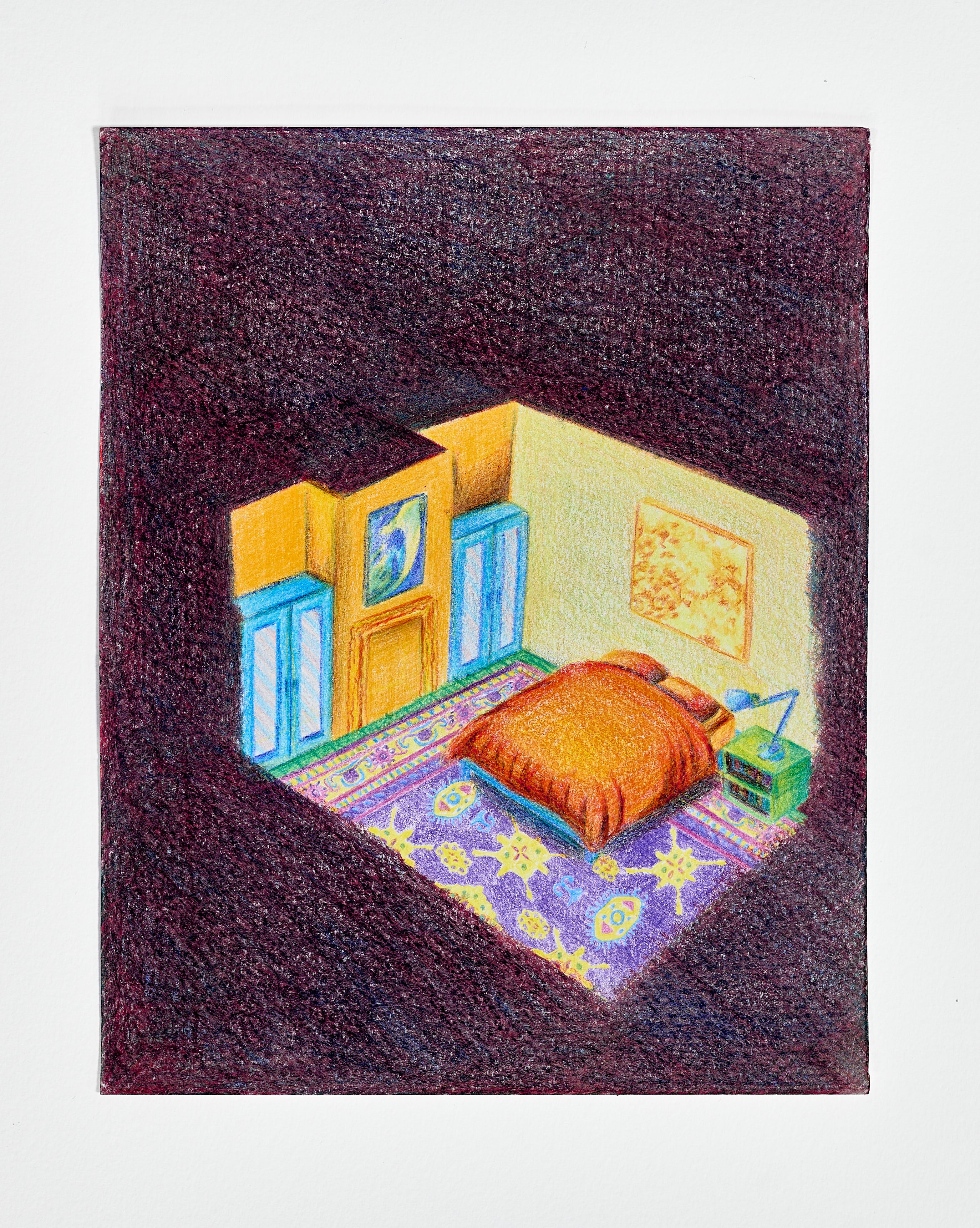 This drawing is part of a series of drawings that depict rooms, objects, symbols and words immersed in a void suspended between reality and imagination. Laced with personal significance, these vignettes explore the cognitive dissonance between reality and dreams.