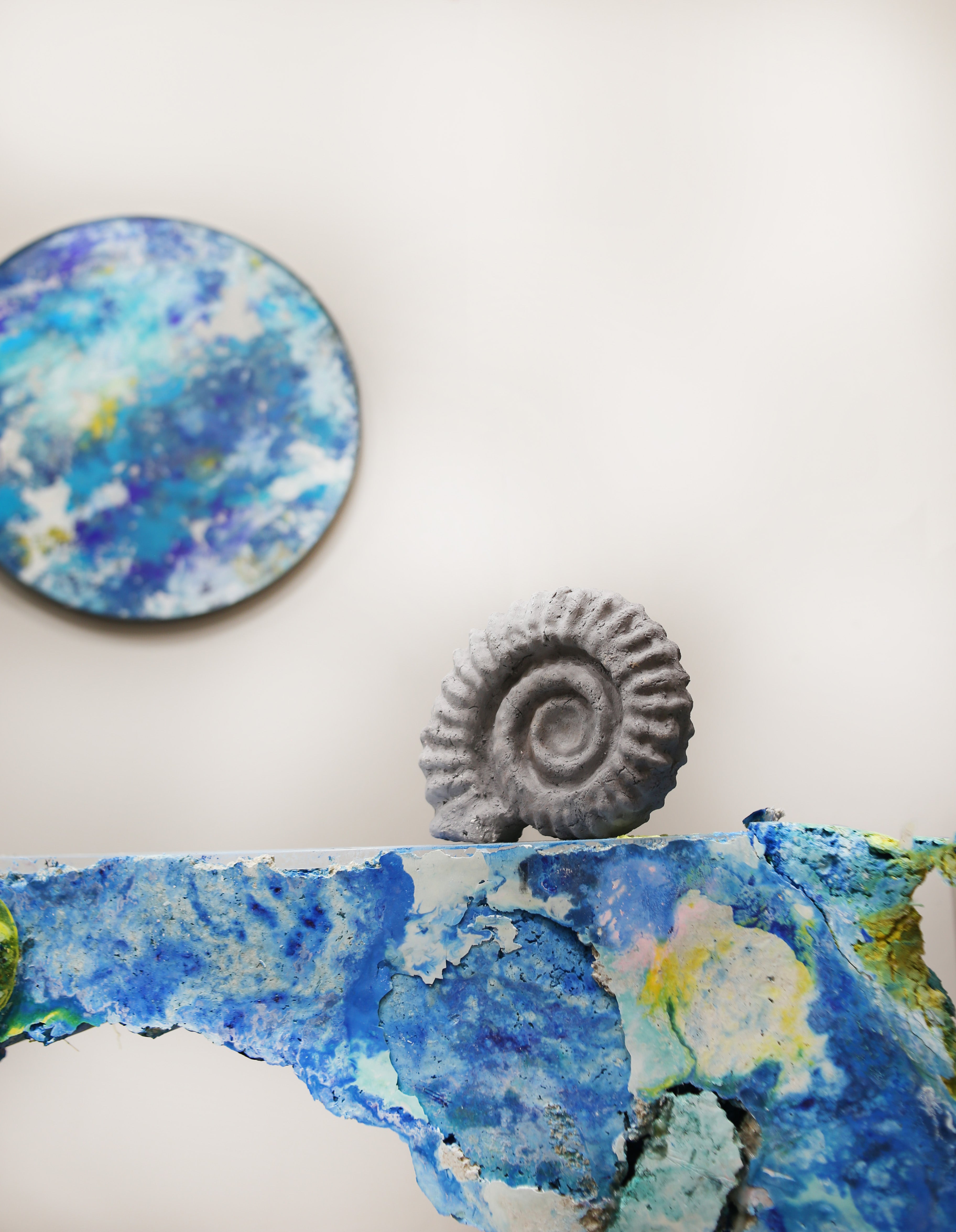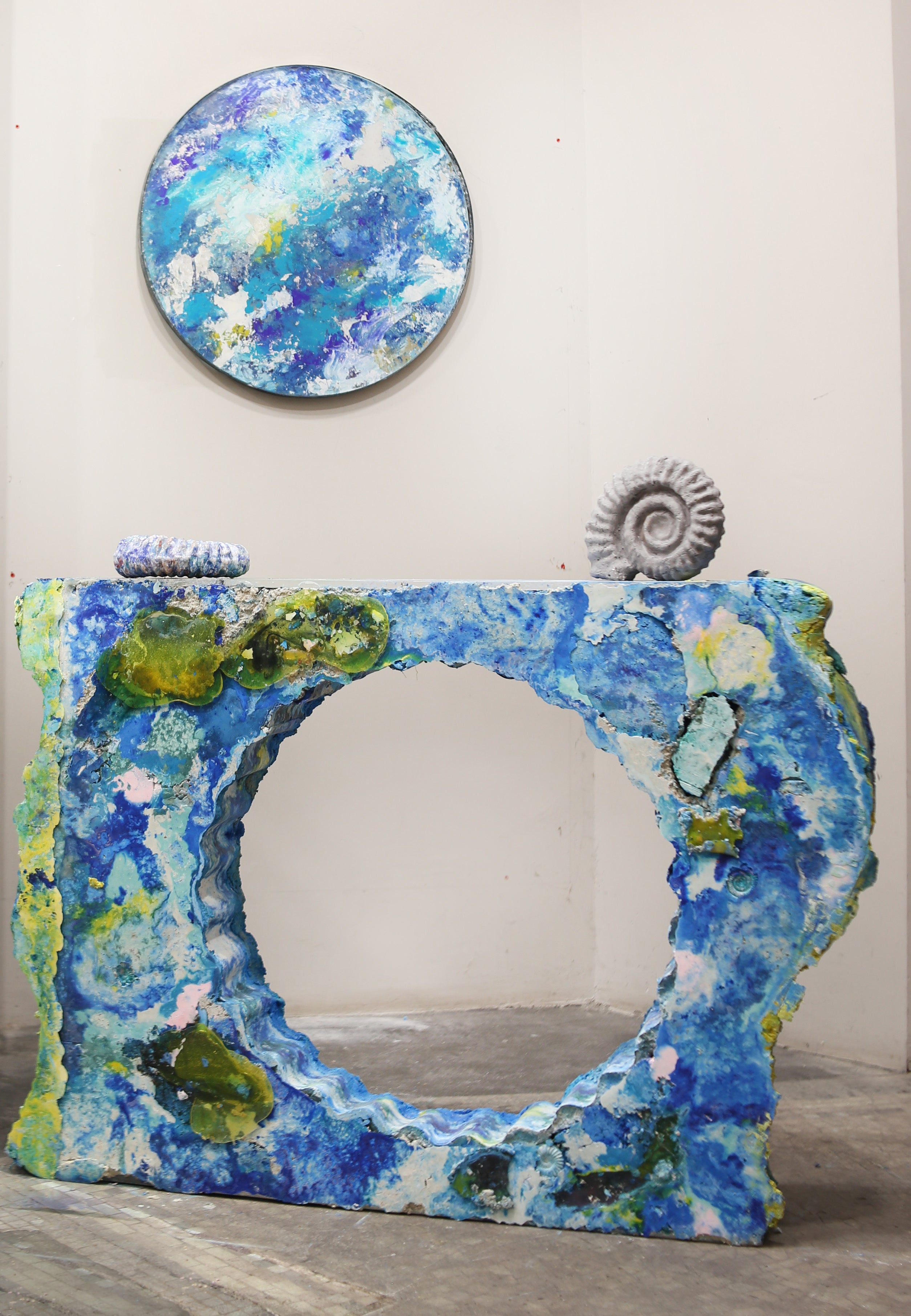 Mèn-an-Tol imagines new age sediments forming over deep time, compressed concrete, toxic chemicals, heavy metals, plastics forming layers of hybrid urban geology. Inspired by the neolithic monument, Mèn-an-Tol, embedded in the Cornish landscape, said to have healing powers. The surface depicts future hybrid life forms, reminiscent of lichens and mosses - the first pioneer plants to grow on rocky terrain, where even the most depleted landscapes can be reclaimed by nature and transformed into new life. Made in tandem with the painting ‘Luna’ 2024 where the centre was cut out, evoking a process of excavation of borehole digging in archaeology.