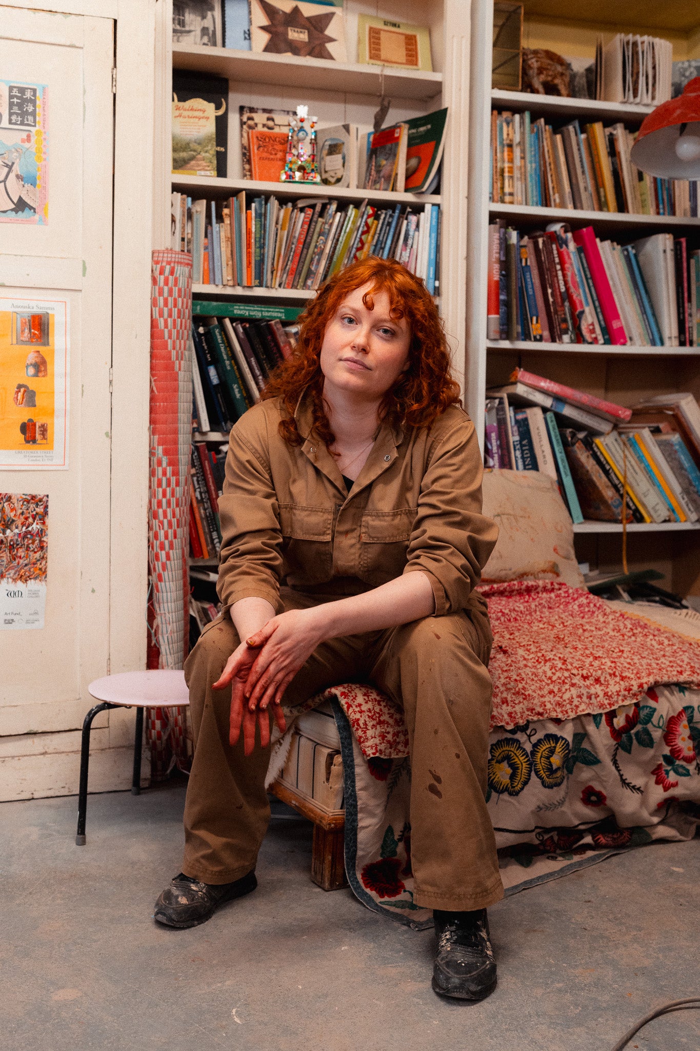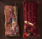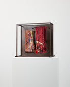 Layered notions of domesticity underpin Samms’ work. This piece is part of a series entitled, ‘Leftovers,’ where Samms merges discordant elements: heavy, patinated steel offset by intricate weavings of upcycled silks, leather offcuts, hair. Working with synchronicities and accidents, nothing is discarded. Consequently, perceived ‘failures’ of artistic process – breakages in the kiln, unintentional rips – are reimagined as deconstructions of traditional forms. Samms weaves the textile elements of her works, bringing together ‘leftovers’, debris of the home, creating something new. This body of work asks: what do we amass around ourselves to make a home feel secure?