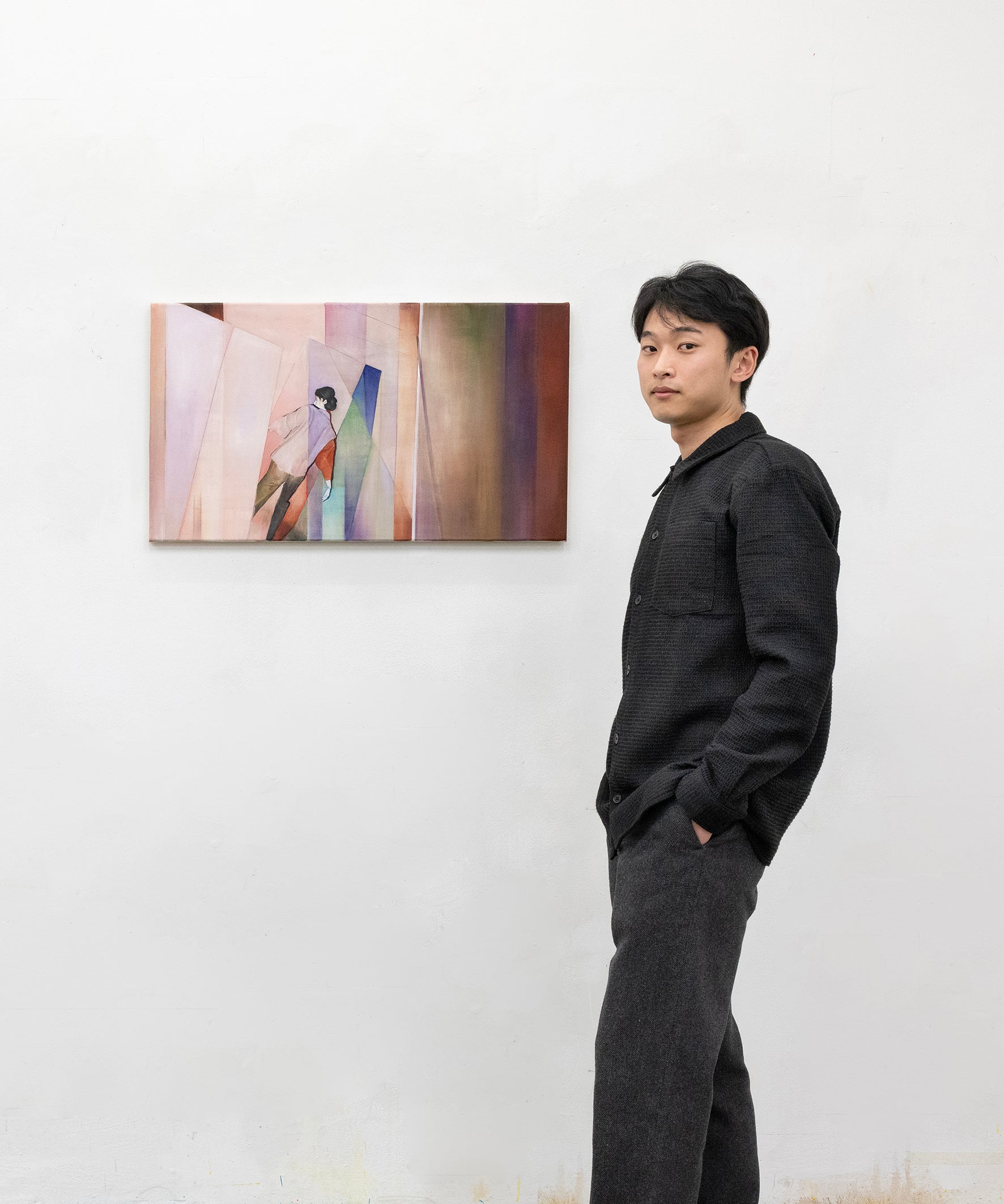 A quiet dissonance unfolds as cold, blue-inflected currents drift against fleeting rose-lit echoes—an interplay of warmth and detachment suspended in time. At the center, a figure folds inward, less a body than a gesture of rupture, tension held between the impulse to resist and the pull to disappear. Space fractures into soft planes and angular ruptures, as presence slips into absence, and form into dissolution. The image offers no resolution—only the lingering breath of something unravelling at the edge of becoming, between thresholds of life, death, and the fading trace of memory.
