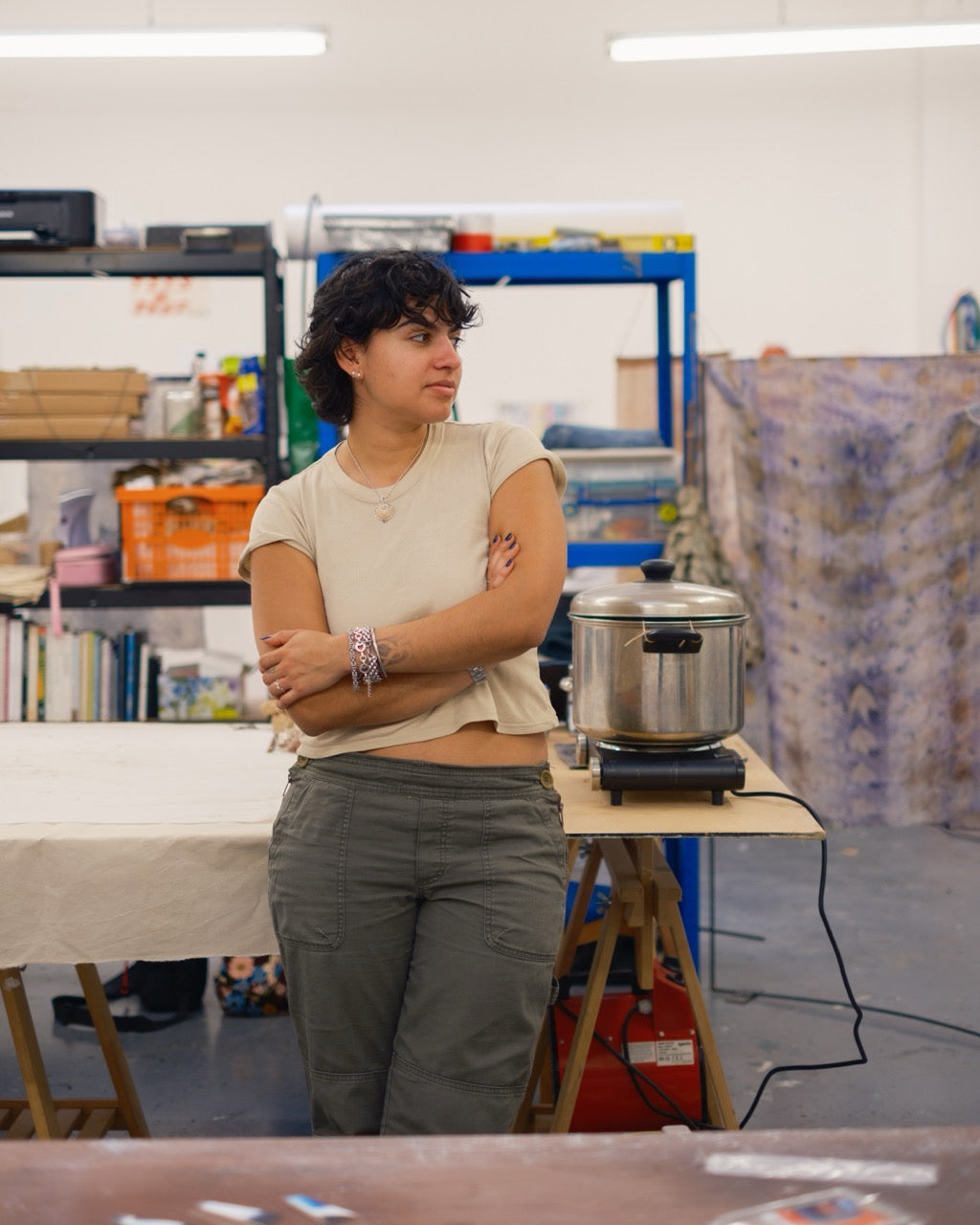 For fabric of fluency (sky) the setting of the work plays a vital role in shifting the perspective of the installation to one of reverence and reflection. The work creates a moment of contemplation, inviting visitors to engage deeply with the more-than-human kin responsible for creating the abstract compositions across the tapestries. The context of the plants used to dye each piece marks them as being in ritualistic communion with the nonhuman elements that now find themselves within these walls.