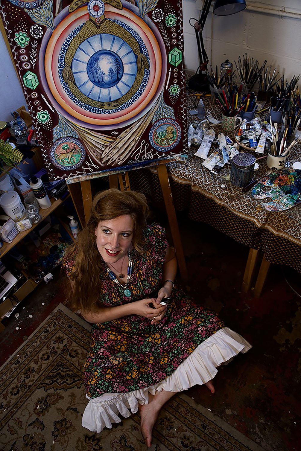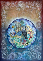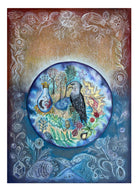 This painting explores emblematic imagery in connection with the planet Jupiter. It takes motifs from Greek and Roman mythology, and alchemy to create a swirling vortex of symbols and corresponding motifs to this planet. It decorates the central sphere with plants that correspond to the planet Jupiter in astro-herbology. It explores an enchanted perspective of the universe, that in the age of the Anthropocene, welcomes a sacred ecology perspective and an inspirited perception of nature. The central motif is a spiral, an important symbol in ancient sacred art forms, representing the cyclical patterns of change found throughout the natural world.