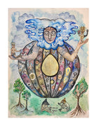 The Cloud of Unknowing was the title of a book written by an anonymous monk from a Carthusian order in the 14th century. The text explores how knowledge of the divine can be expressed through poetry and wonder, and the observation that the spiritual experience is beyond that which the rational mind can effectively describe. Sharing the same title, this painting is a playful take on this, and contains small hybrid creatures, referencing alchemy and ancient deities. This surreal painting has a gentle and lovingly humorous ambience, creating an enchanted Otherworld to explore the mystical mindset.