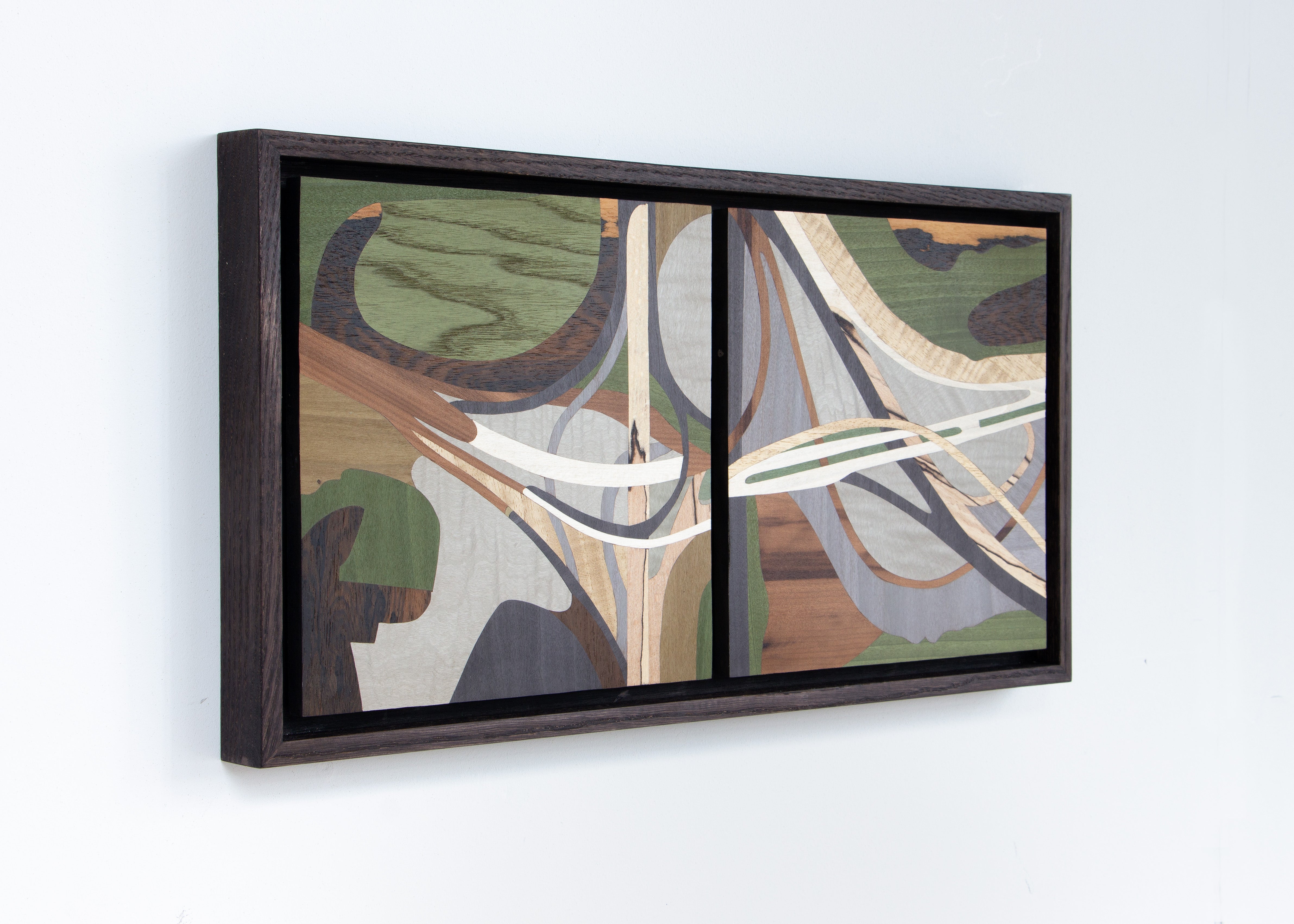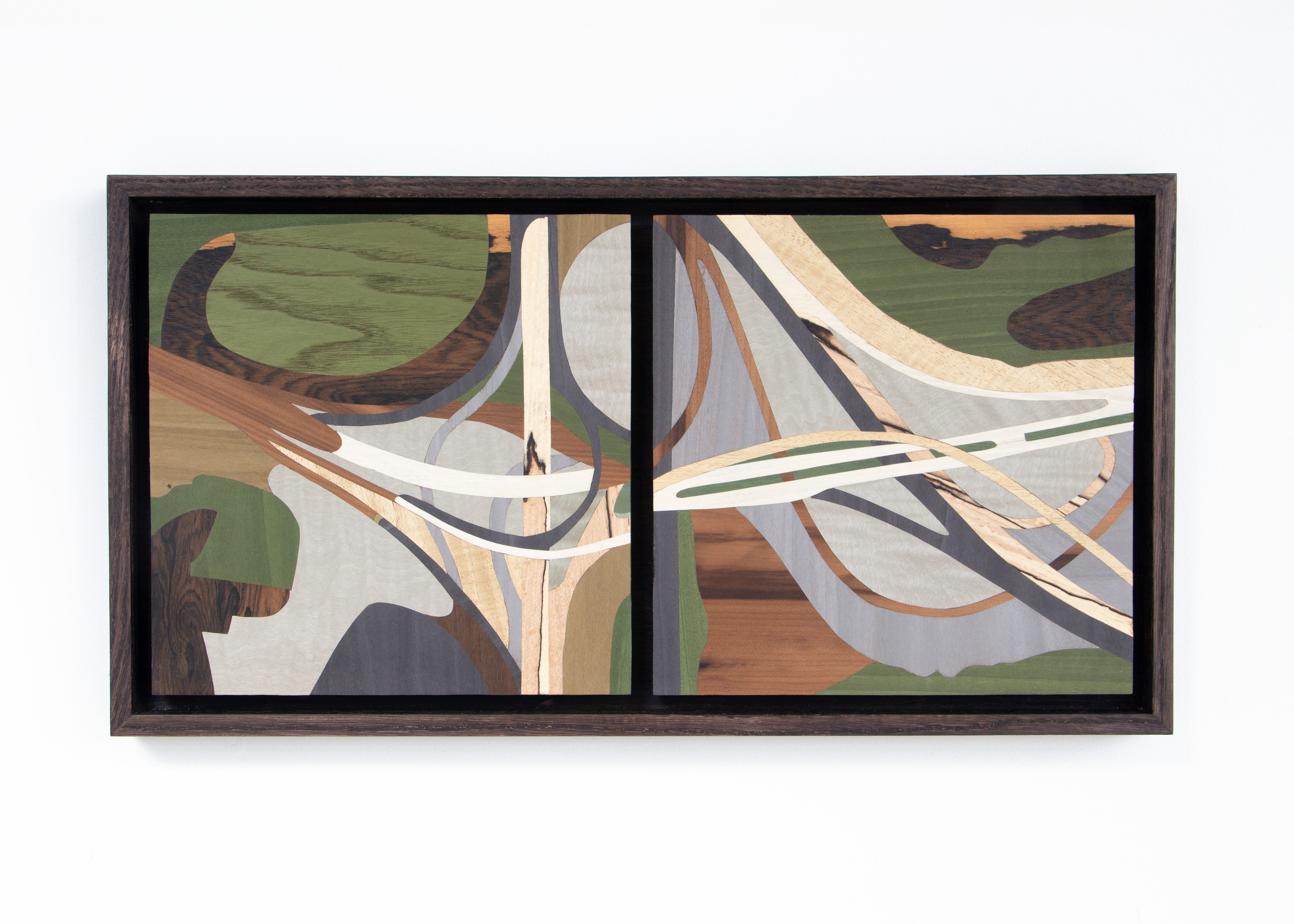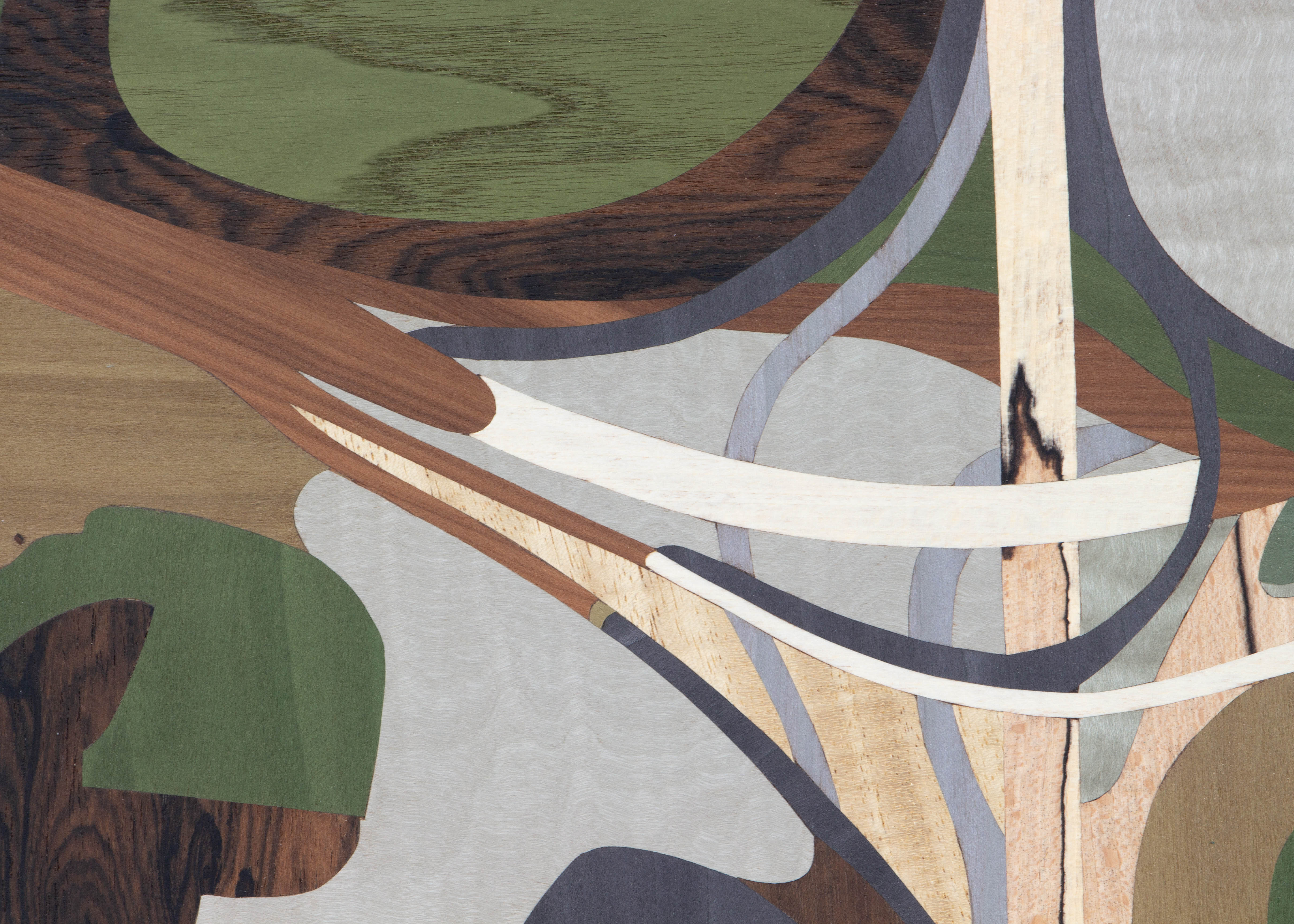 My practice investigates how aerial perspectives have shaped our perception of landscape, incorporating marquetry techniques to examine scale, flatness, remoteness and abstraction. Through these processes my work shifts the pictorial plane away from a knowable landscape towards a vague terrain that re-frames our relationship to the land. I draw links between abstraction and the weaponisation of landscape through the invention of aerial imaging for surveillance and reconnaissance purposes. I’m interested in the archival function of satellite imaging; its role in recording and revealing traces of human interventions preserved in the land such as agricultural patchworks, cityscapes, transport networks and earthworks.
