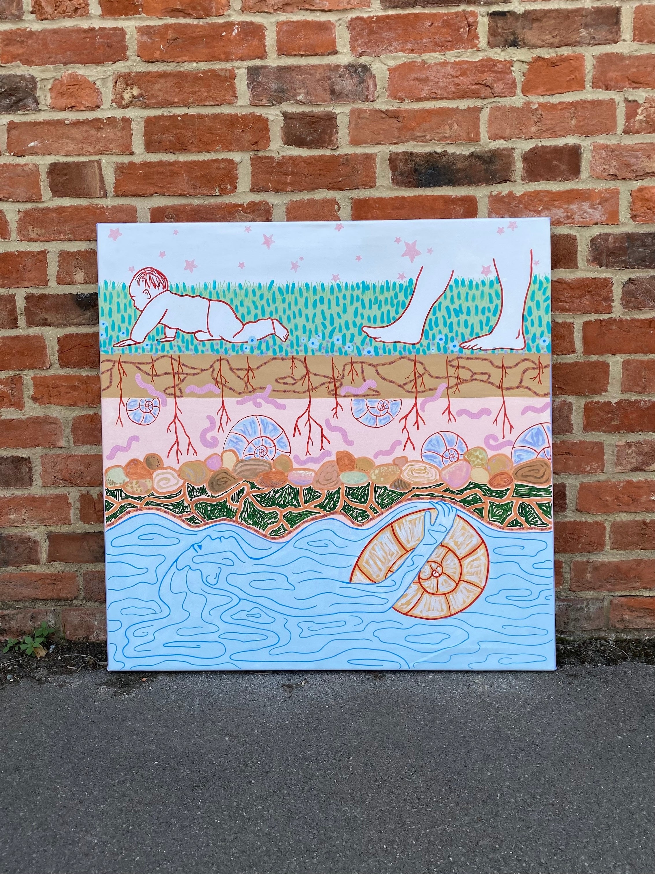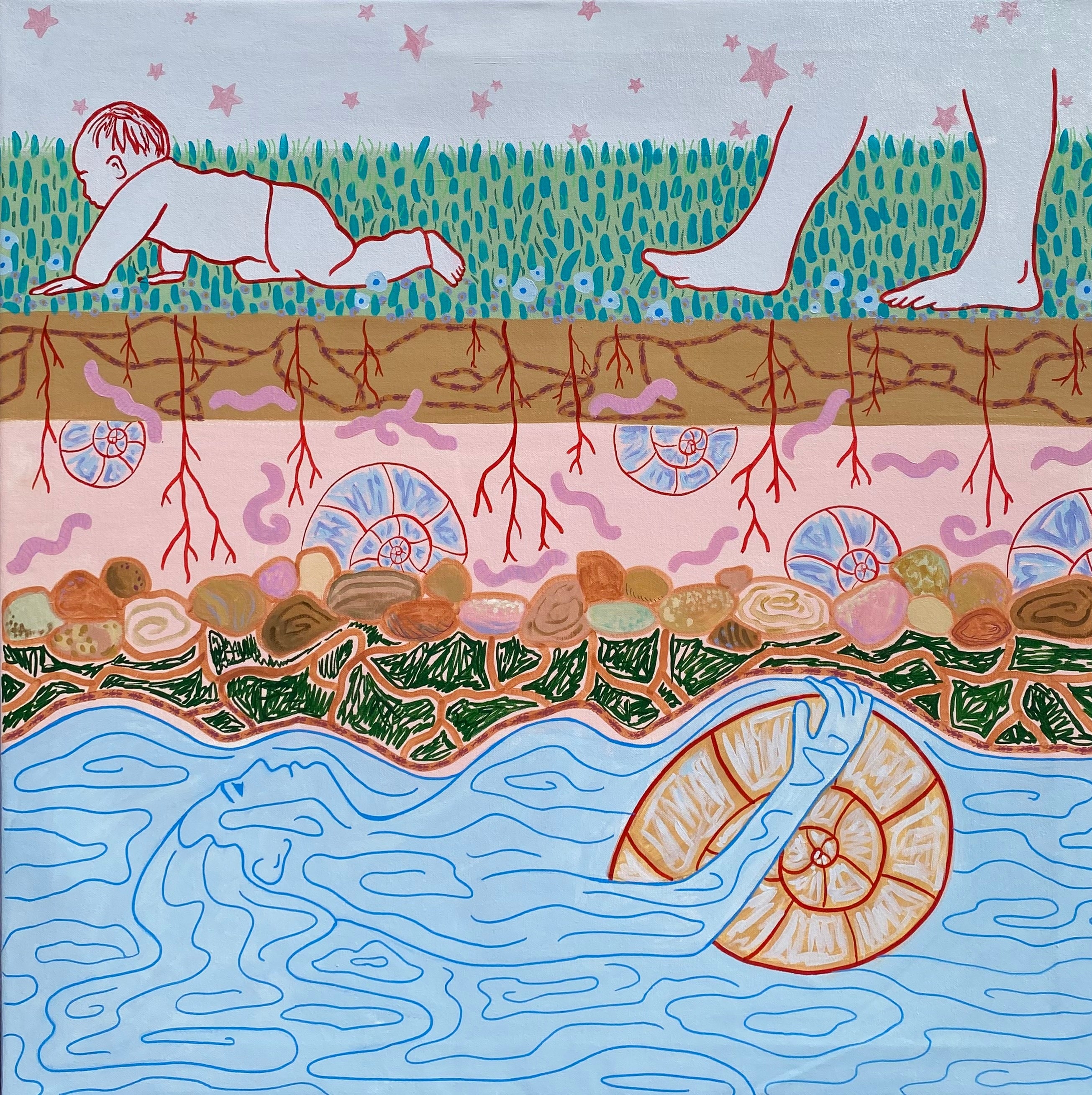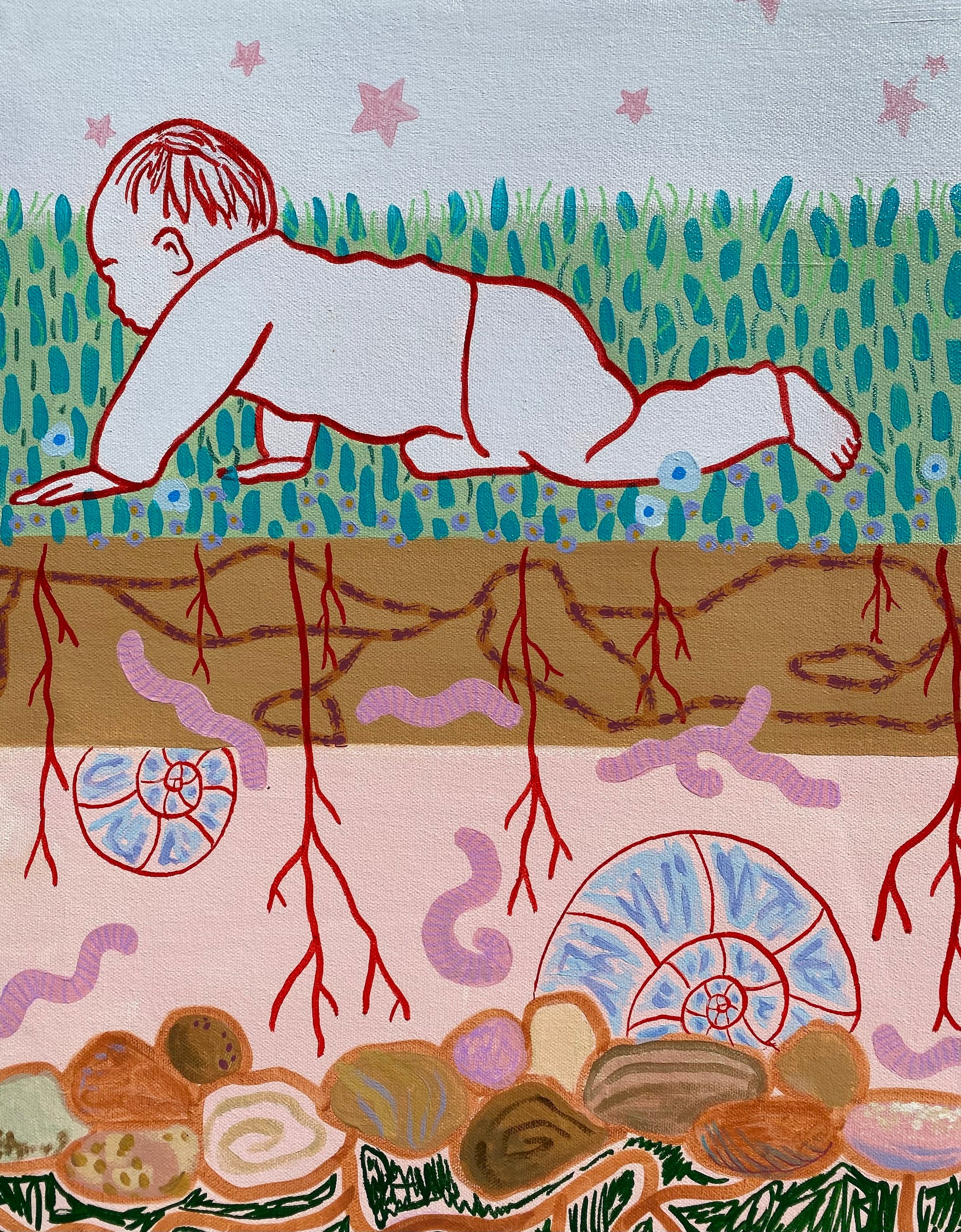 My recent paintings explore moments of shared wonder and protectiveness, within a mother and child's shared and individual experiences of pregnancy, postpartum, infancy and childhood. Nature is a third presence, revealing, transforming, and reclaiming the figures.