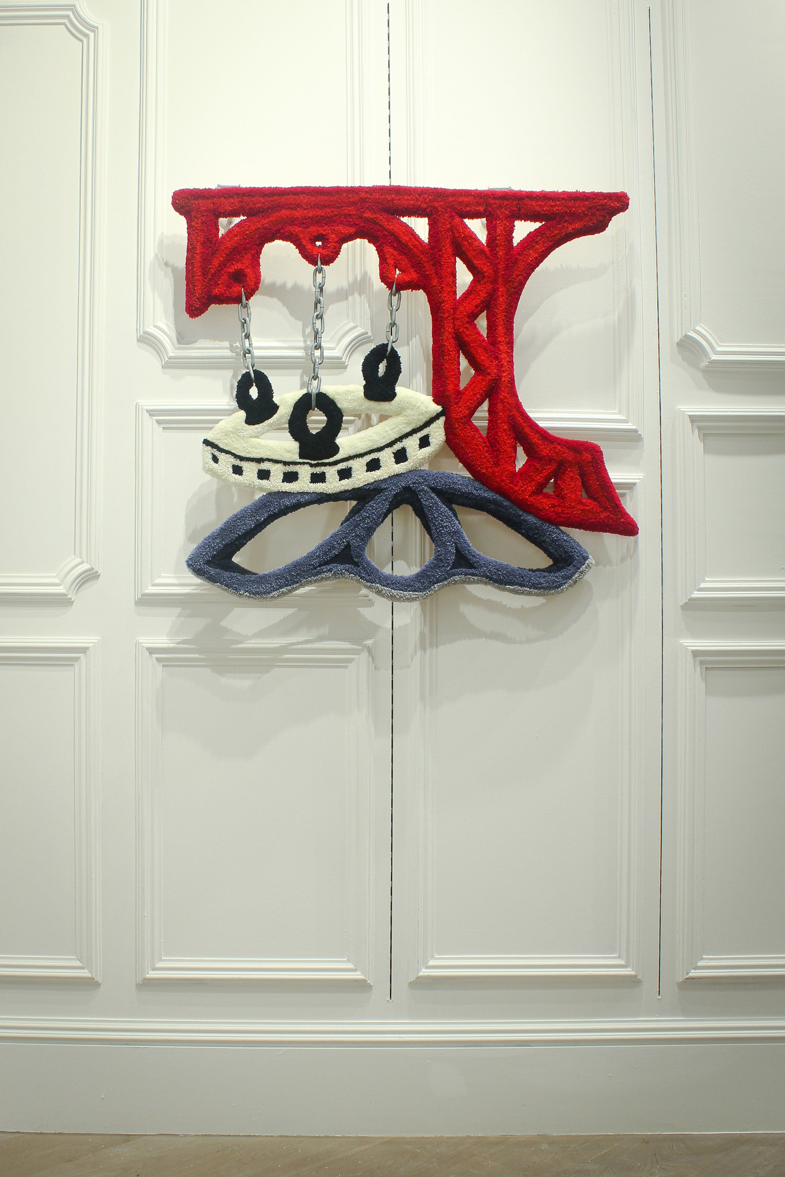 Medium: Acrylic yarn, nylon backing, latex glue, steel chain, hardboard backing, D ring
