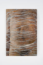 Held Taut shows a figure caught in tension, wrapped in white lines that feel both restraining and electric. These marks don’t just bind; they seem to pulse, to glow, to touch something deeper. It’s hard to say where the pressure comes from — whether it’s internal, remembered, or forced upon the body from elsewhere. Nothing here is neutral. The surface is charged. What holds this figure isn’t peace or wellness, but a live current — emotional, political, intimate. Something flickers just beneath the skin. A body on edge, lit by its own resistance.