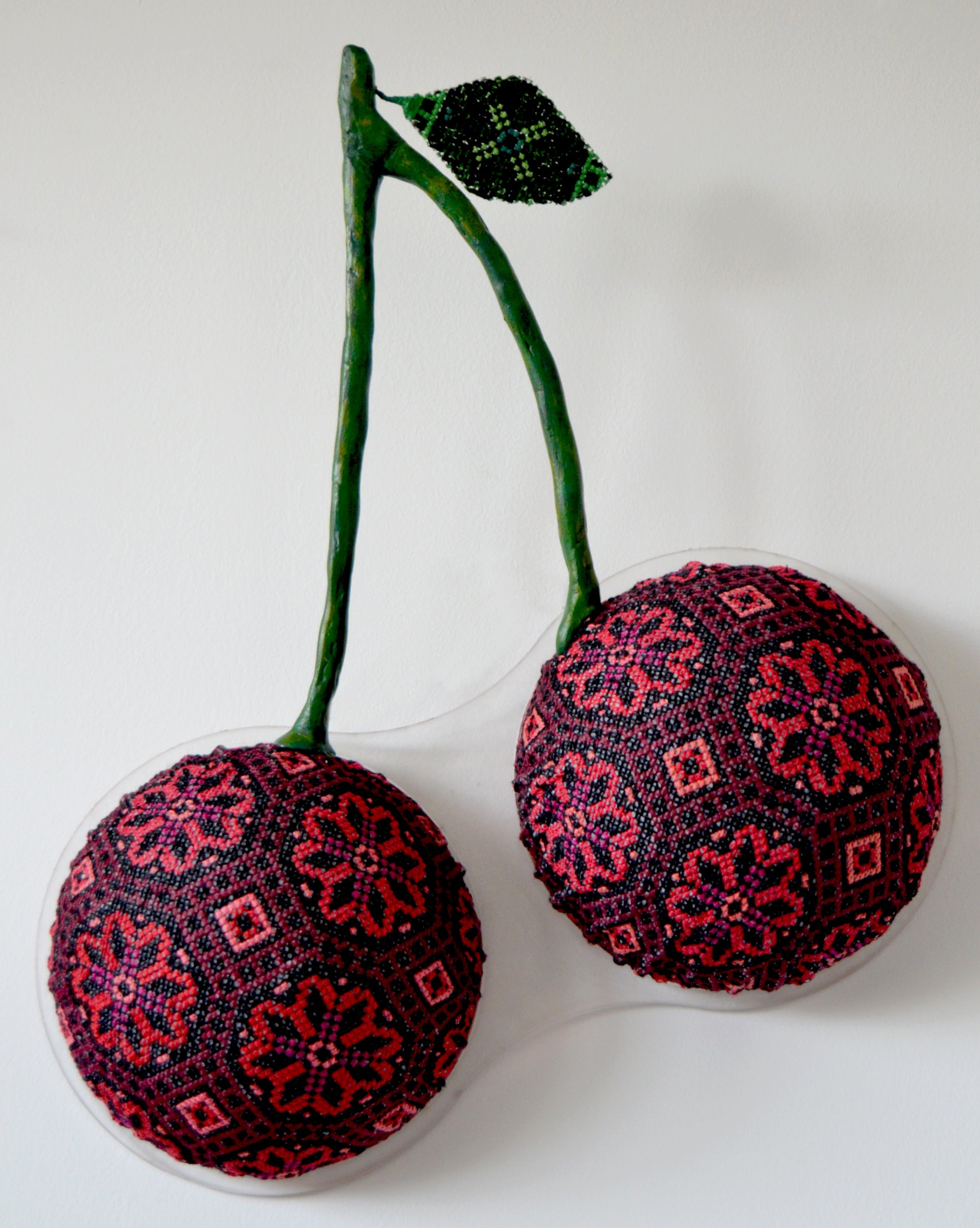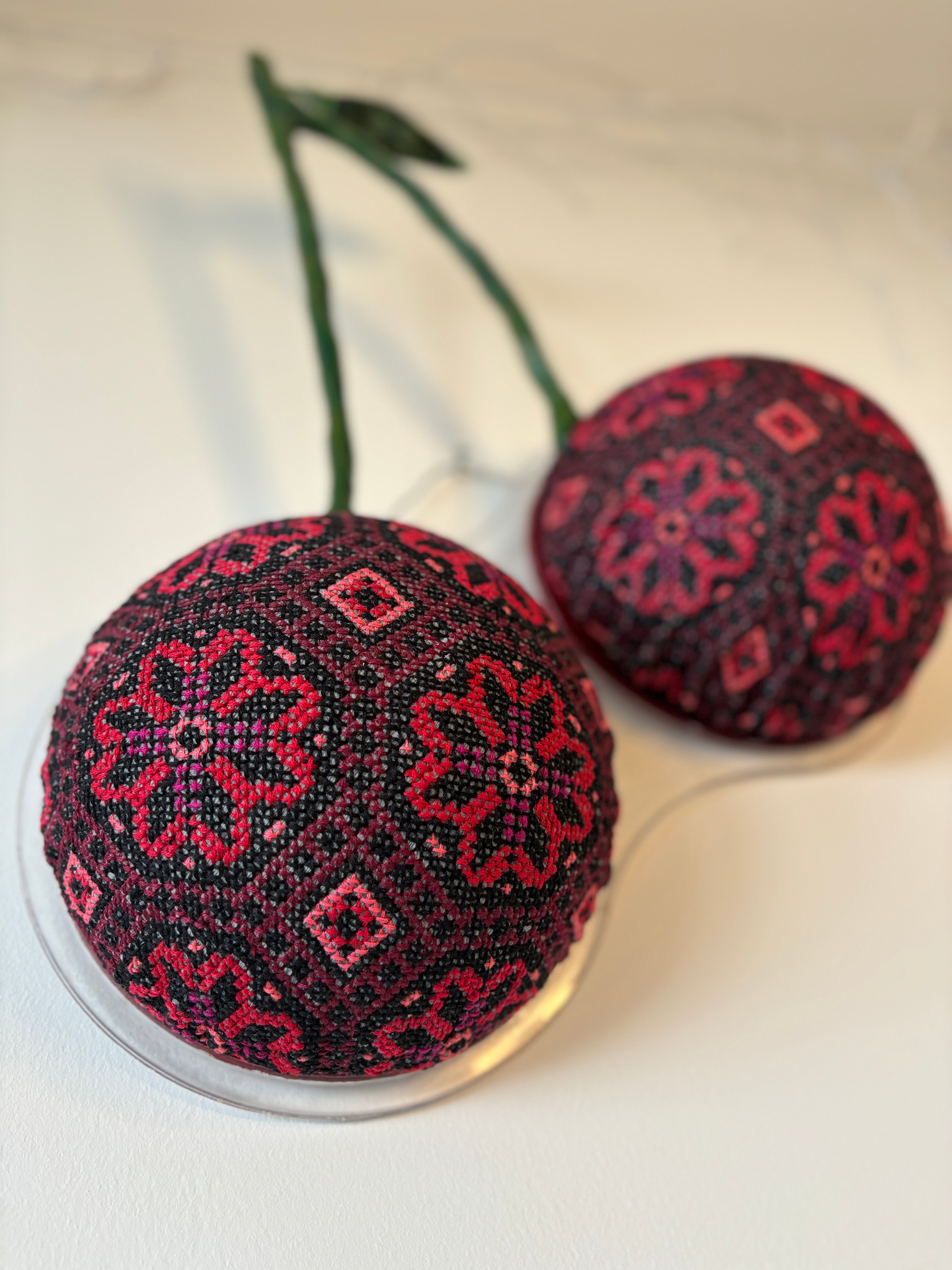 ‘Cherries’ is the third instalment of my embroidery series. Having done a watermelon, a symbol of resistance and victory, previously I wanted to continue the theme of fruit for this project. Cherries are still very prominent in Ukraine as a flavour in sweet snacks and drinks. It is a berry that I associate with the summers I spent in Ukraine, with my grandmother giving me homemade cherry jam and cakes. This piece is an ode to my nostalgia and to traditions such as embroidery which hold a deep-rooted importance in preserving the vibrancy of our culture regardless of external influences.