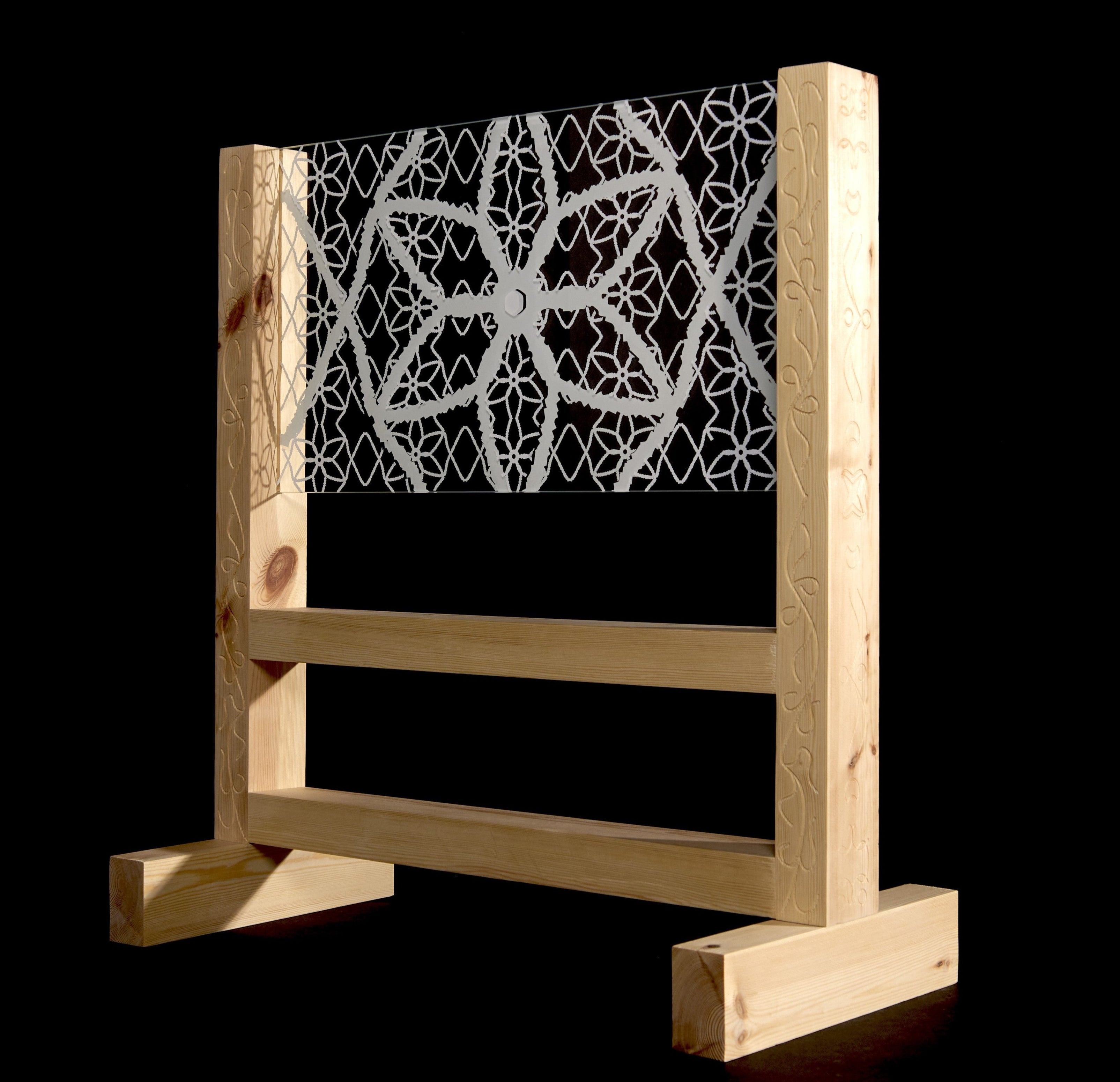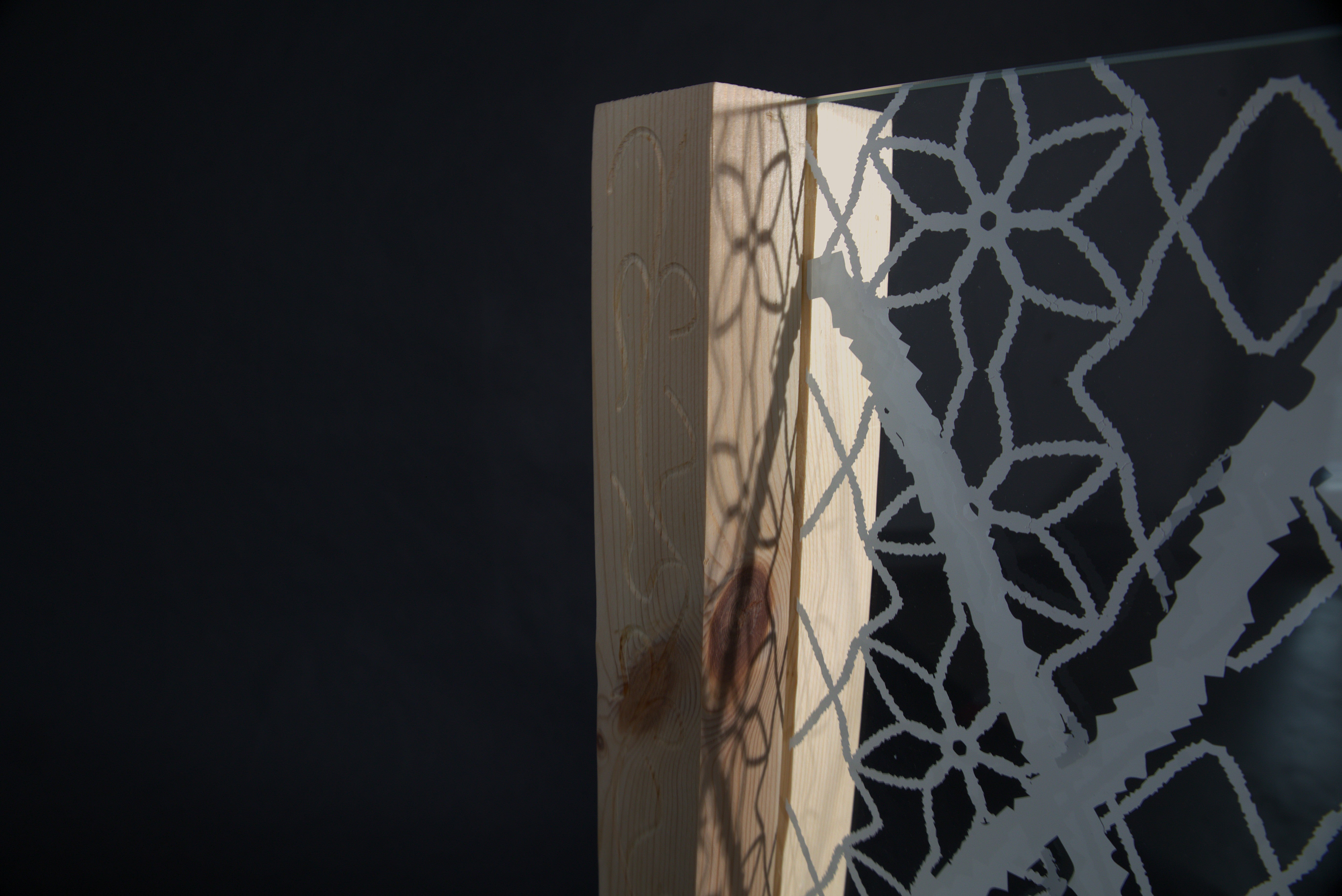 Mine Mask, Thy Frame' is a sculptural work exploring transformation, vulnerability, and emotional defense. A delicate, diaphanous mask is double UV-printed onto glass, evoking the fragile evolution of a white rose. Its thorns and further-developed patterns are CNC-engraved into a wooden frame, uniting protection and exposure. The glass acts as both shield and screen—inviting yet distancing—while the mask symbolizes the emotional veneers we wear. Blending digital fabrication with tactile materiality, the piece invites reflection on what we choose to hide or reveal, and how concealment shapes identity.