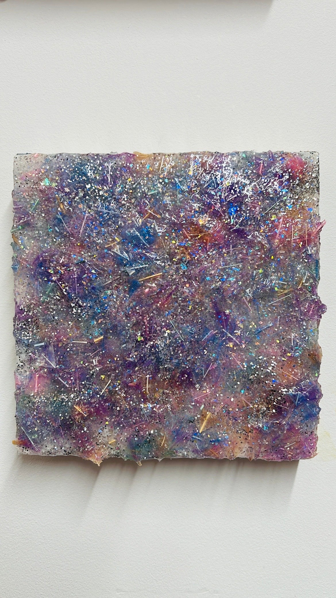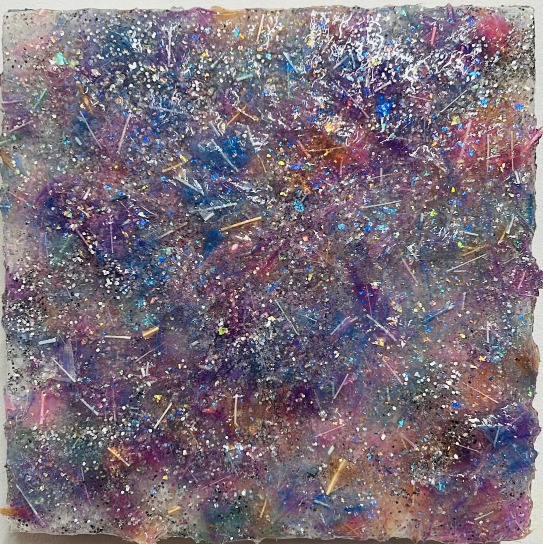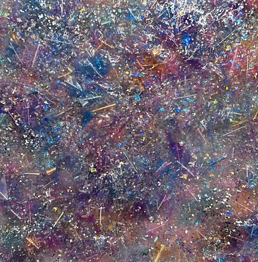 This artwork shimmers with a rich, textured surface, crafted from hand-dyed synthetic feathers I made myself. Iridescent hues of violet, indigo, magenta, and silver swirl together, interspersed with flecks of glitter and holographic fragments. The composition suggests a fantastical landscape—like a lake under moonlight—where light catches on every surface, revealing hidden depth and motion. The organic edges and tactile quality reflect the careful, hands-on process. A balance of spontaneity and harmony, the piece draws viewers into its radiant complexity, inviting reflection on the interplay between nature and imagination through the lens of artistry and material experimentation.