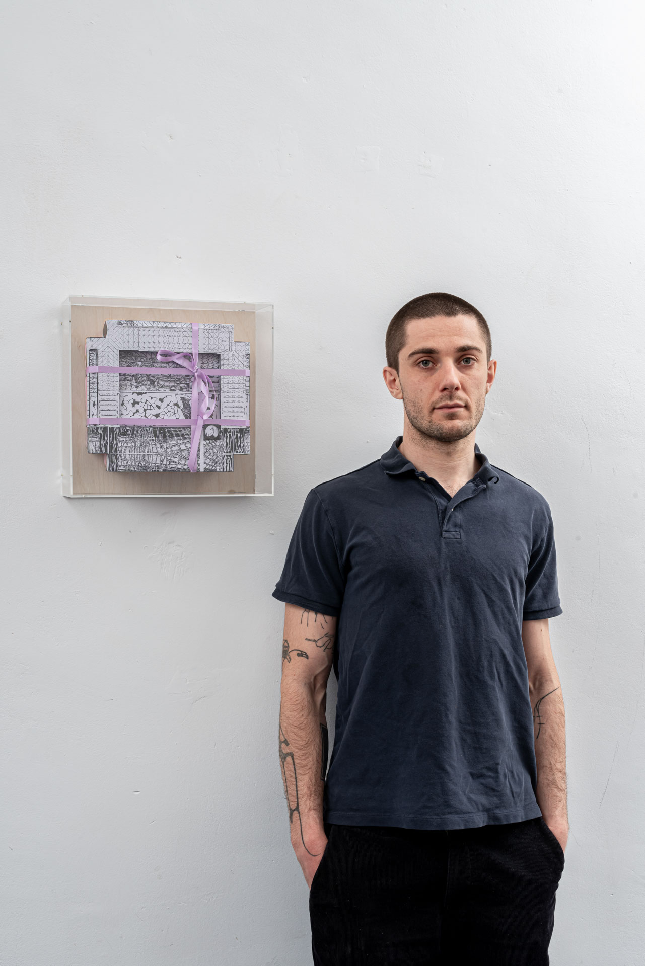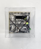 The series it’s from explores controlled abstraction through intended aesthetic design. Due to the notion that each work in the series is a kind of portrait. Initially via the idea of a box being a representation of self, in the sense of a hidden interior space. -this is why there's sometimes holes in the lids, playing with the idea of communication/connection between interior+exterior. Then the aesthetics speak to a wider portraiture than just self, of places, memories and conditions. Equally as boxes they’re somewhat commodified, which is a mirror to consumption in how we brand things and ourselves aesthetically.
