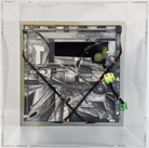 Medium: Pencil on folded paper (the lid), foam board, black cord with red polymer thread, hi-vis material, plastic toggles, birch wood, plexiglass.