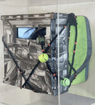 Pencil on folded paper (the lid), foam board, black cord with red polymer thread, hi-vis material, plastic toggles, birch wood, plexiglass.