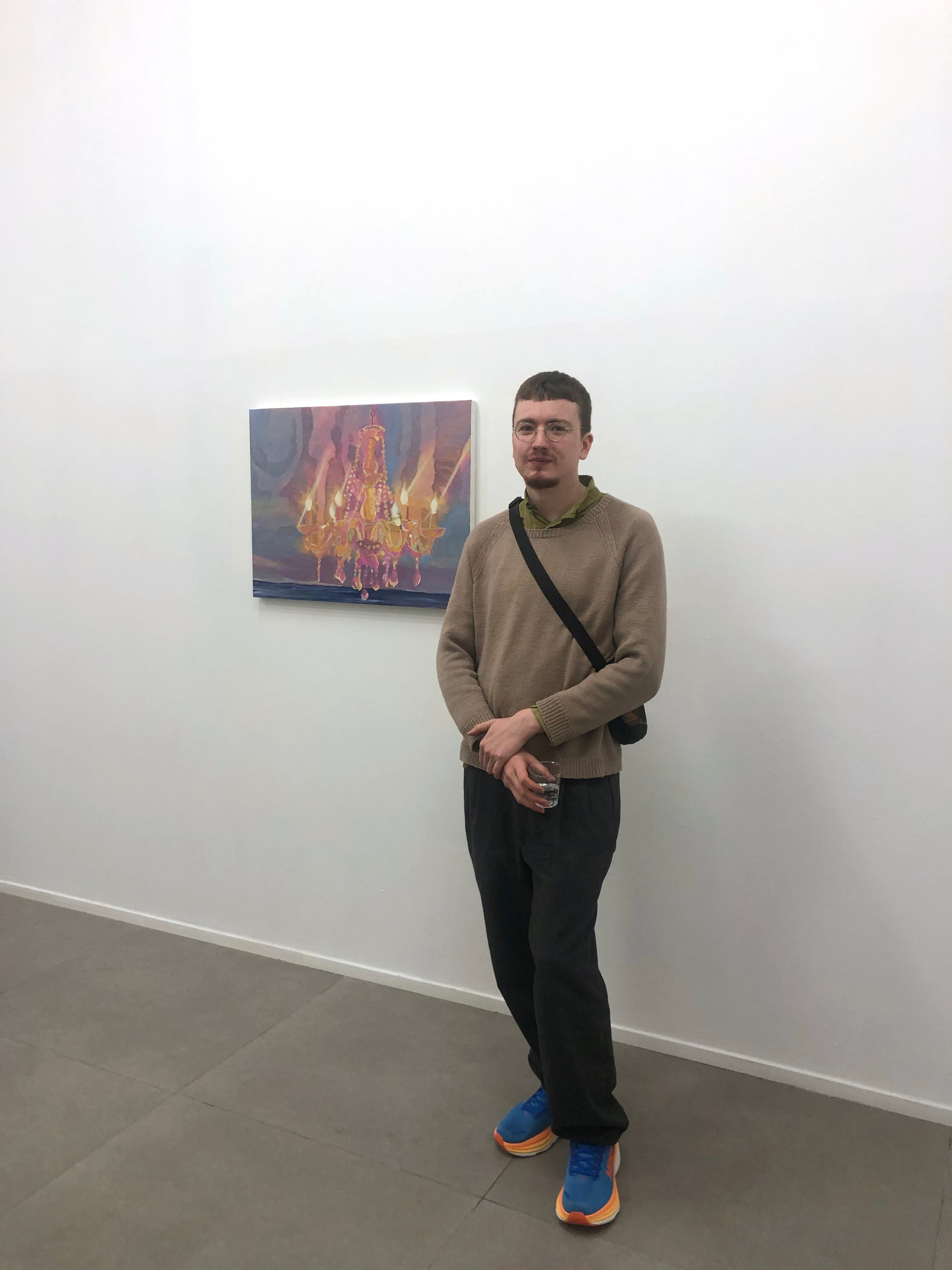 Throughout Camerno's work the chandelier symbolizes a society frozen in a moment of hypnotically beautiful collapse. Begun in 2021 Camerno's series Consolation and Depravity was inspired by Émile Zola's L'Assommoire and the heroine's tragic decent into depravity. The series depicts a chandelier from The Columbia Hotel in London, which he documented during a residency in 2020 in collaboration with Roman Road gallery. The first two paintings were exhibited as a diptych at Nicola Pedana Gallery in the group show Hyperbole in 2021. He completed the final painting in the trilogy in 2025.
