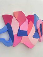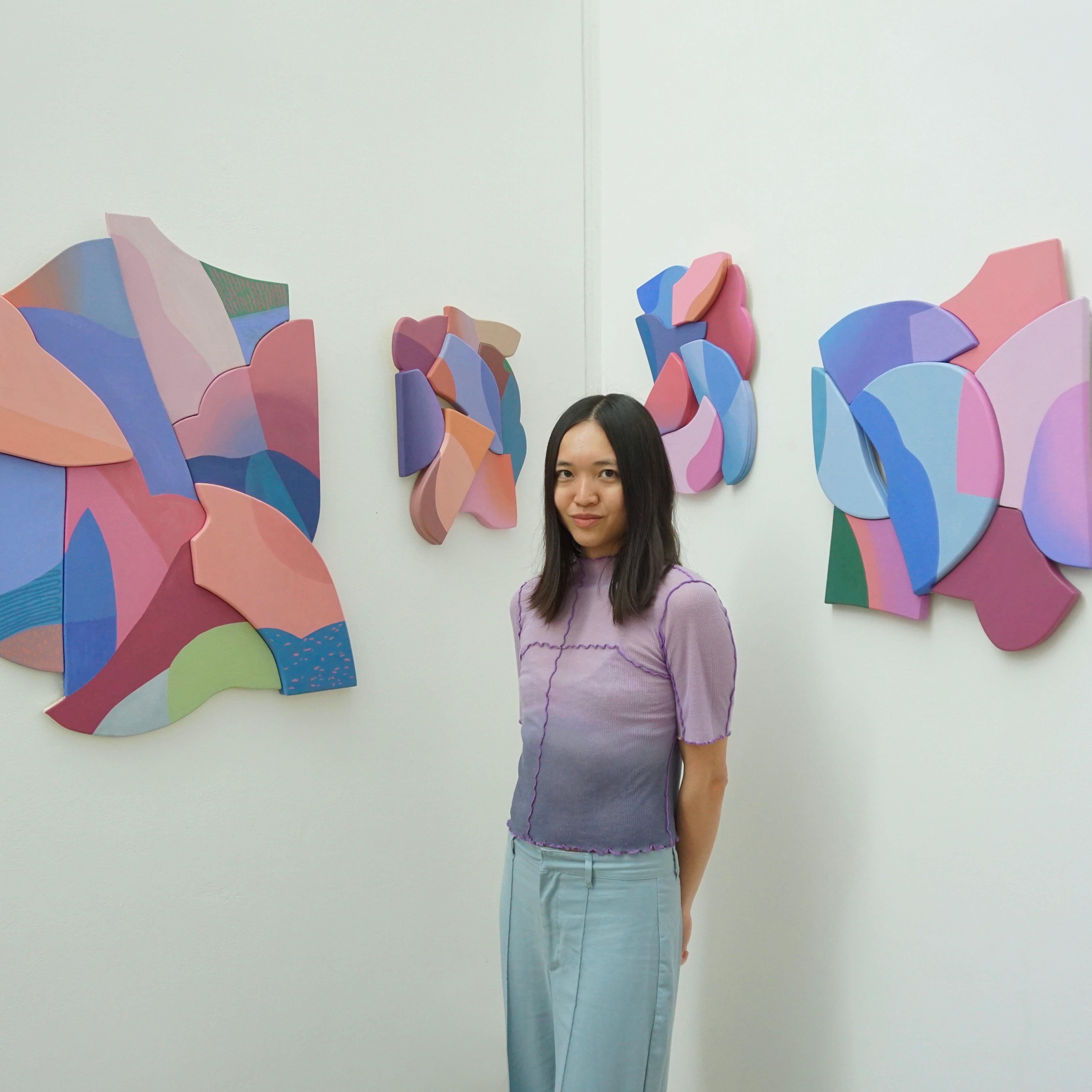 The artwork presents a shaped wall piece exploring balance and movement, inspired by the intuitive cycle of natural systems. Crafted with woodcuts that are shaped into abstract forms and assembled together. Reinterpreting natural forms into shapes that are interacting to create visual rhythm. Within the shaped work, layers of colours intersect one another to create illusion of depth, playing with the sculptural element of the relief work as well as the painted surface. Flutter could refer to the movement of leaves fluttering or feathers fluttering and dancing in the wind.