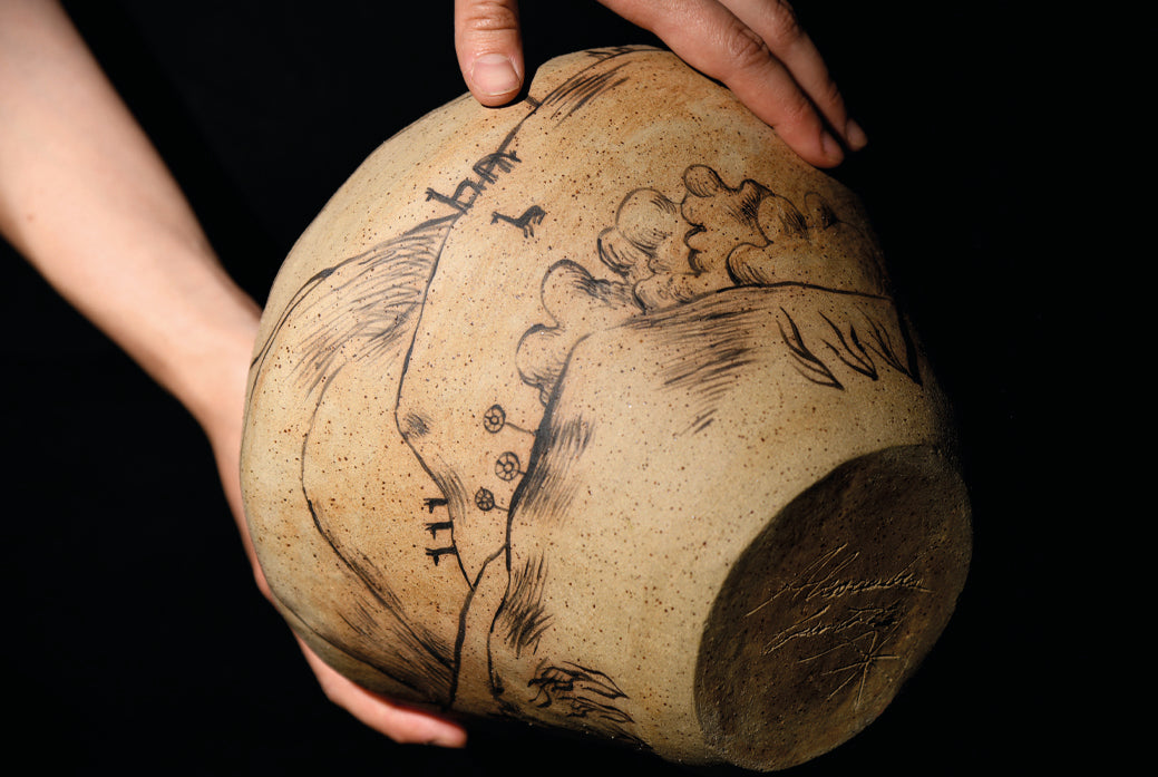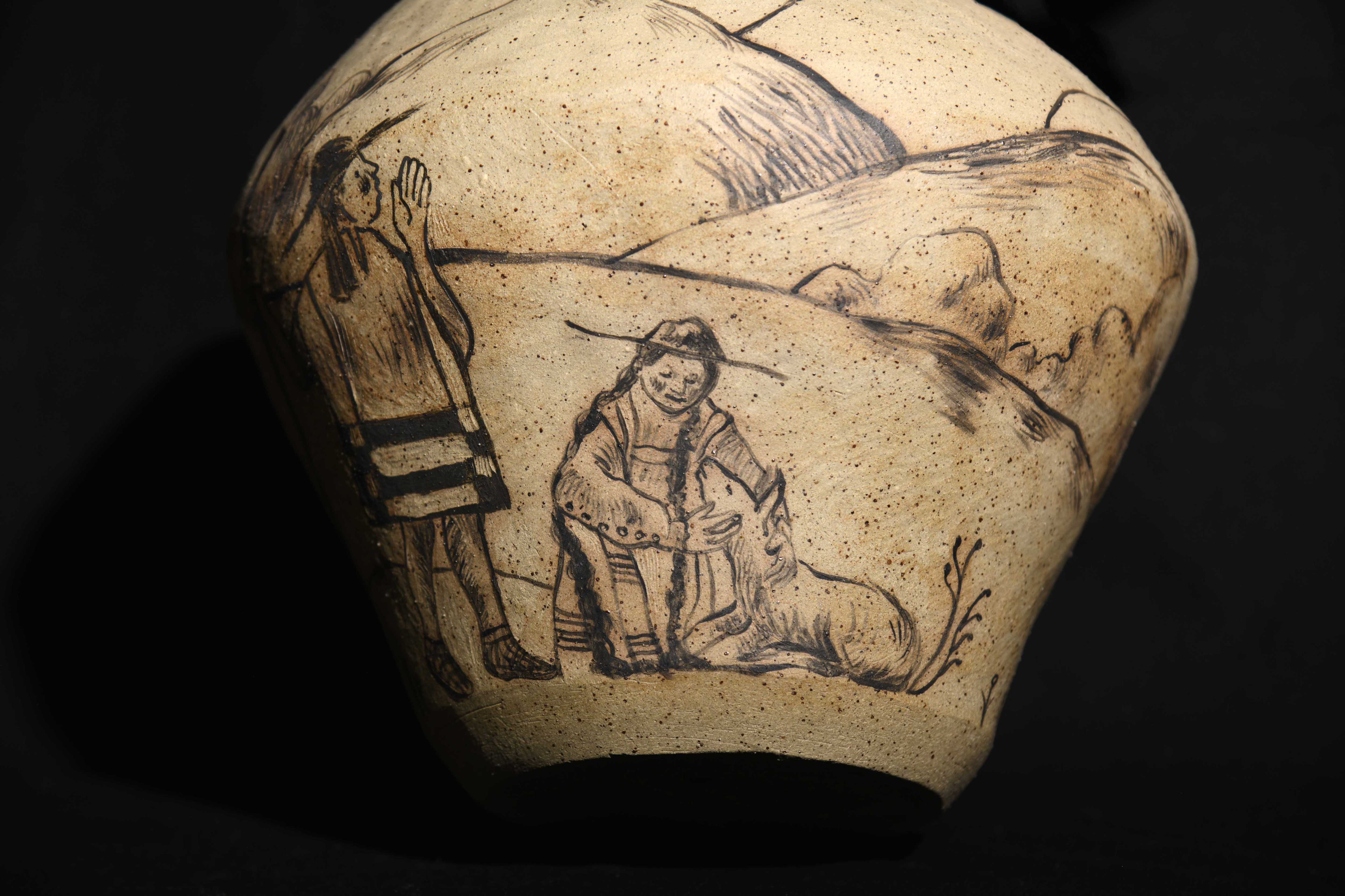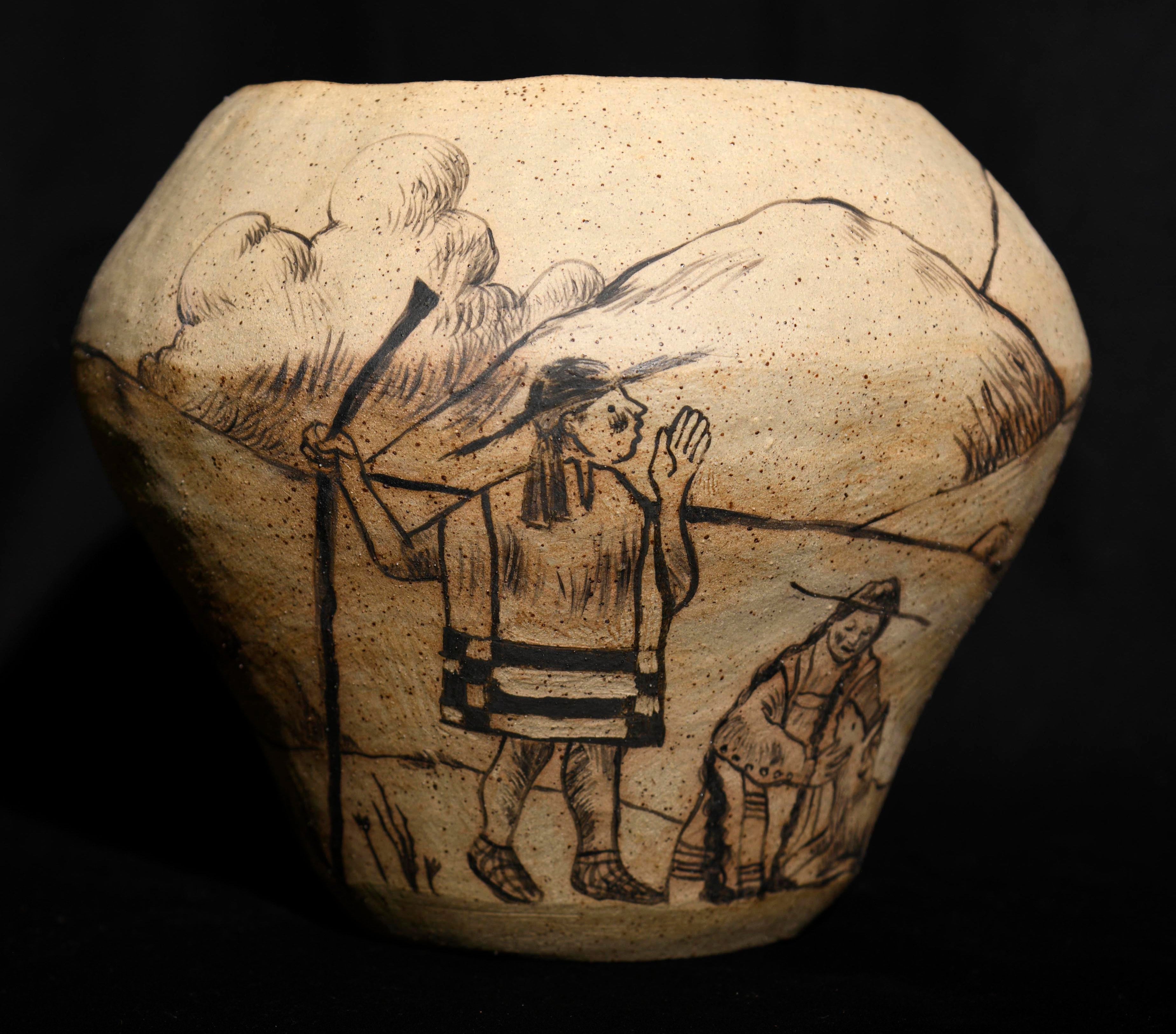 La llamada showcases two farmers in the Andes mountain range executing the ancient practice of transhumance, in this case during the summertime. One farmer calls the llamas, who can be found hiding in different rocky surfaces, at the same time observed by the shining sun and clouds surrounding them. The other farmer takes care of a baby who didn't want to accompany the rest of them. Strong bonds can't be broken even by the inclemency of the weather. This piece was hand-painted with black iron oxide on a hand-built vessel, made with speckled stoneware and single-fired to 1240°C.
