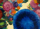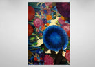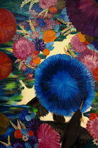 This painting unfolds like a psychological landscape where presence and absence intertwine through a weaving style that layers oil colors and natural pigments. At its heart, a radiant blue flower sphere pulses with vibrant energy, symbolizing heightened consciousness and longing. Surrounding it, blossoms in fiery oranges, purples, and reds emerge from shadowy terrain, each petal a flicker of thought and memory. Dark bird silhouettes hover on the edges, elusive presences evoking mystery. Flowing gold and green spaces represent the silent gaps between emotions and logic. The work meditates on the fragile balance of memory, presence, and perception.