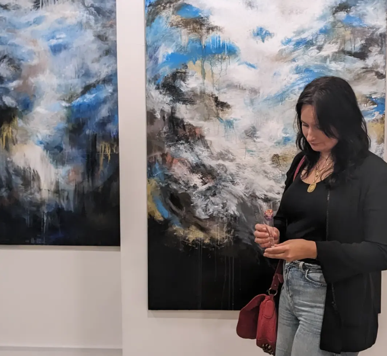 Layers of colour and metallic tones built up using the artists hands to create an impressionistic feel inspired by long Kent coastal walks and the empowerment of feeling strong when alone.