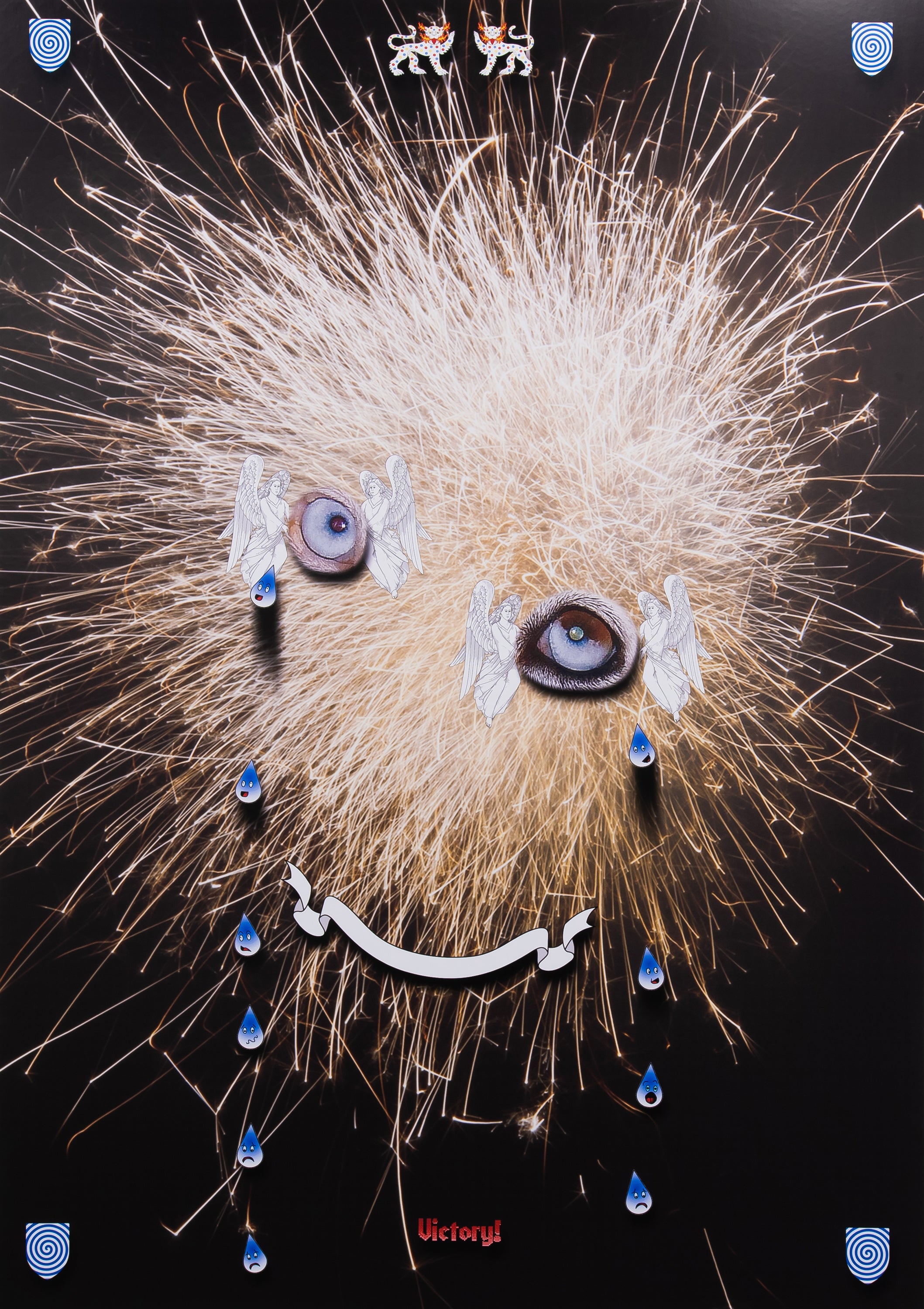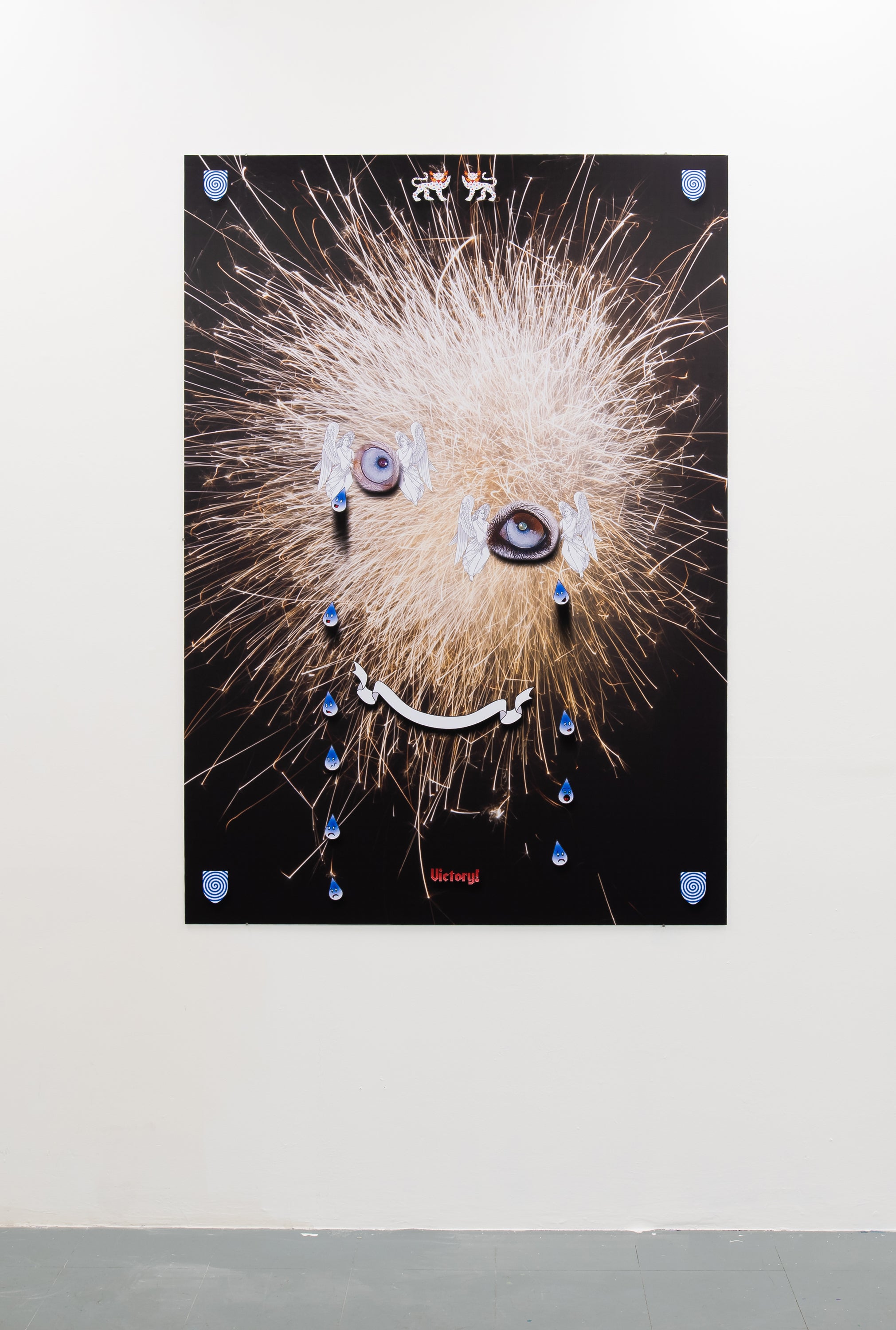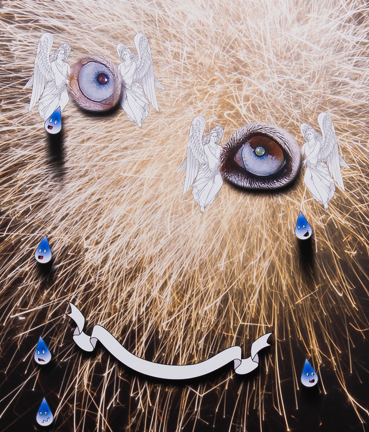 Victory, Loss' is a digital collage made as part of my first solo show 'Factory Reset' in 2022. This body of work is influenced by the media prevalent during lockdown – games, memes, online interfaces, app design – as well as the surreal influences of Magritte and Chagall, and traditions of Trompe-l'oeil painting and hobbyist craft-making. A dog's disembodied eyes follow us around the room, as we keep up a faux smile amidst the pain.
