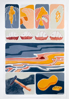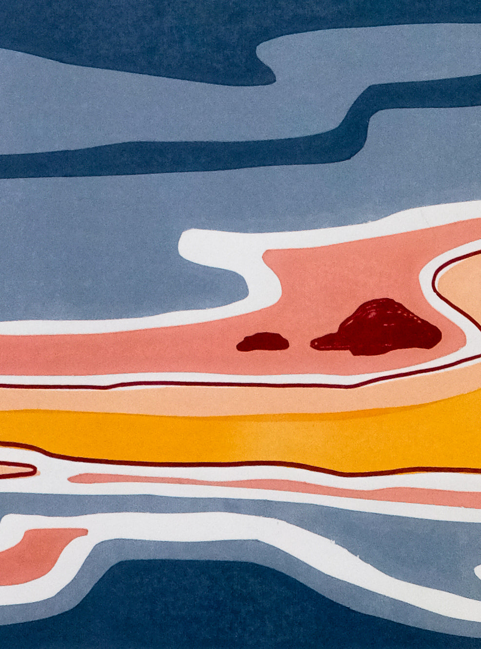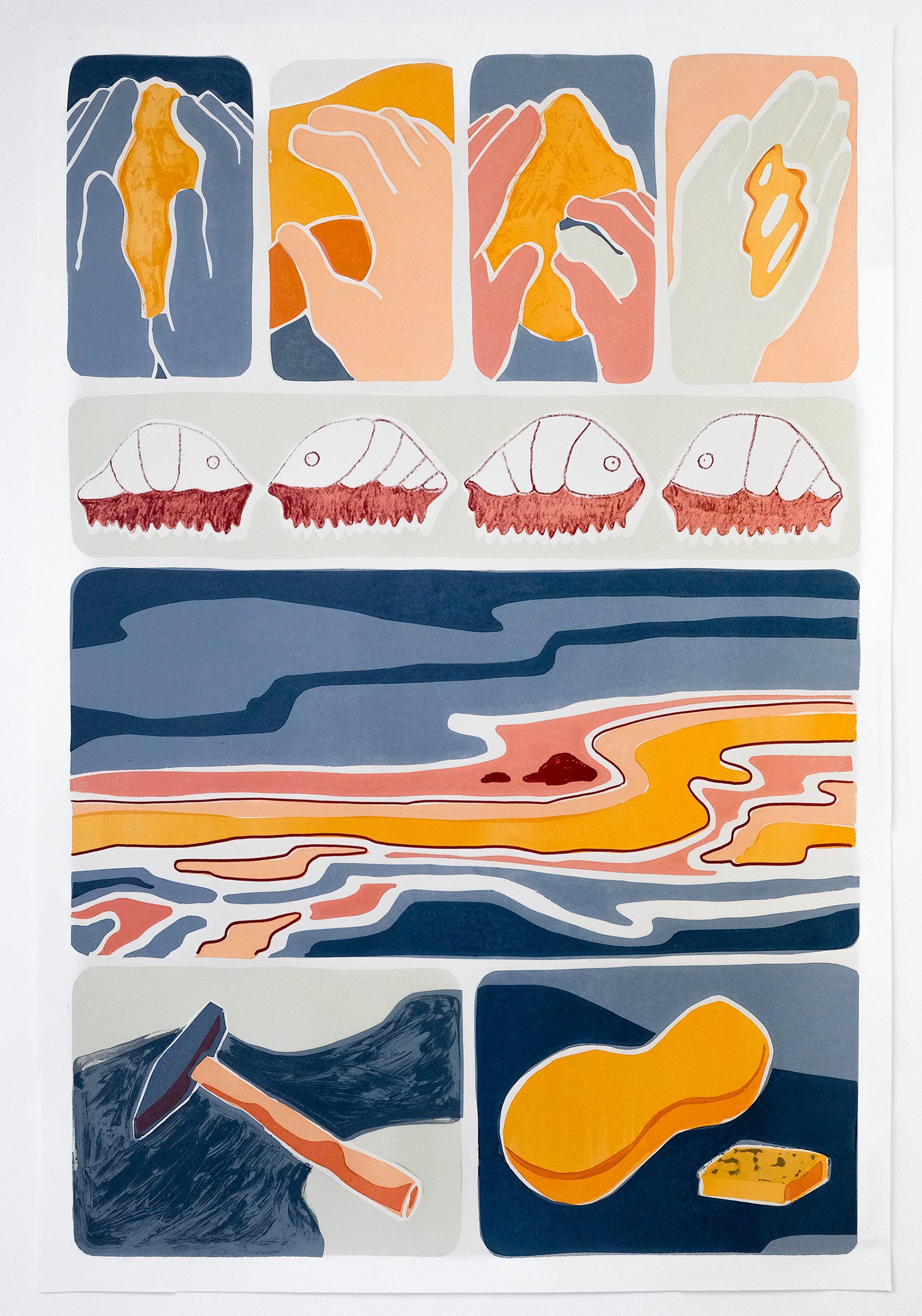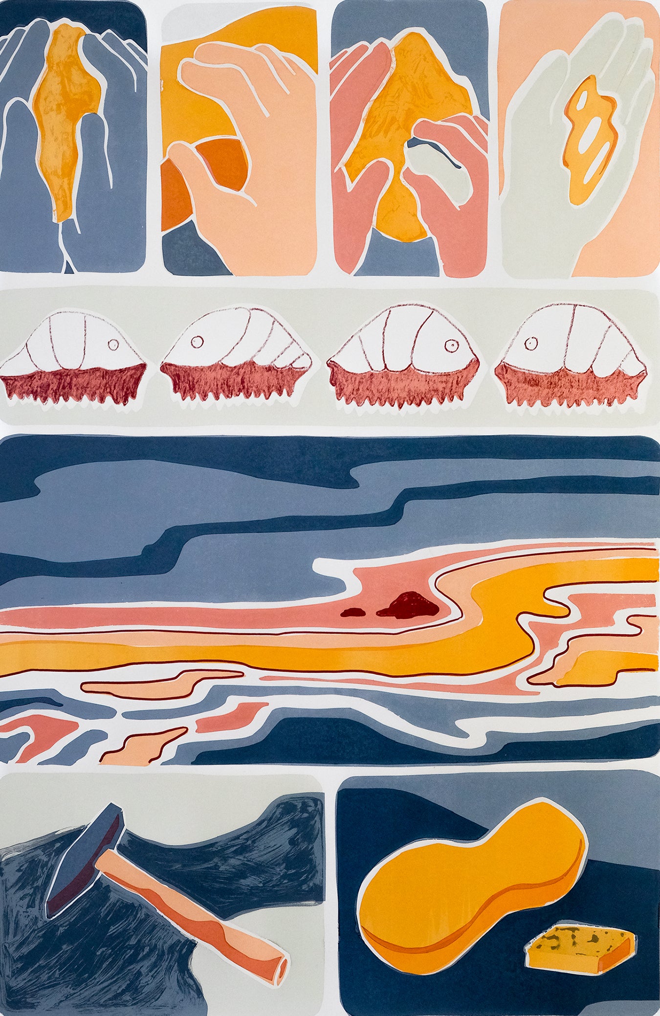 Imagery of rock formations and standing stones appear as recurring motifs in bodies of work spanning screenprinting, documented performance and moving sculptures. In her recent varied edition screenprint series, speculative landscapes are depicted within which workers clean and maintain stone monuments or broken rock-like fragments. Through these works, she employs visual myth-making to ask how geological materials might be able to shape our notion of home, labour, ecological maintenance, and the passing of time.