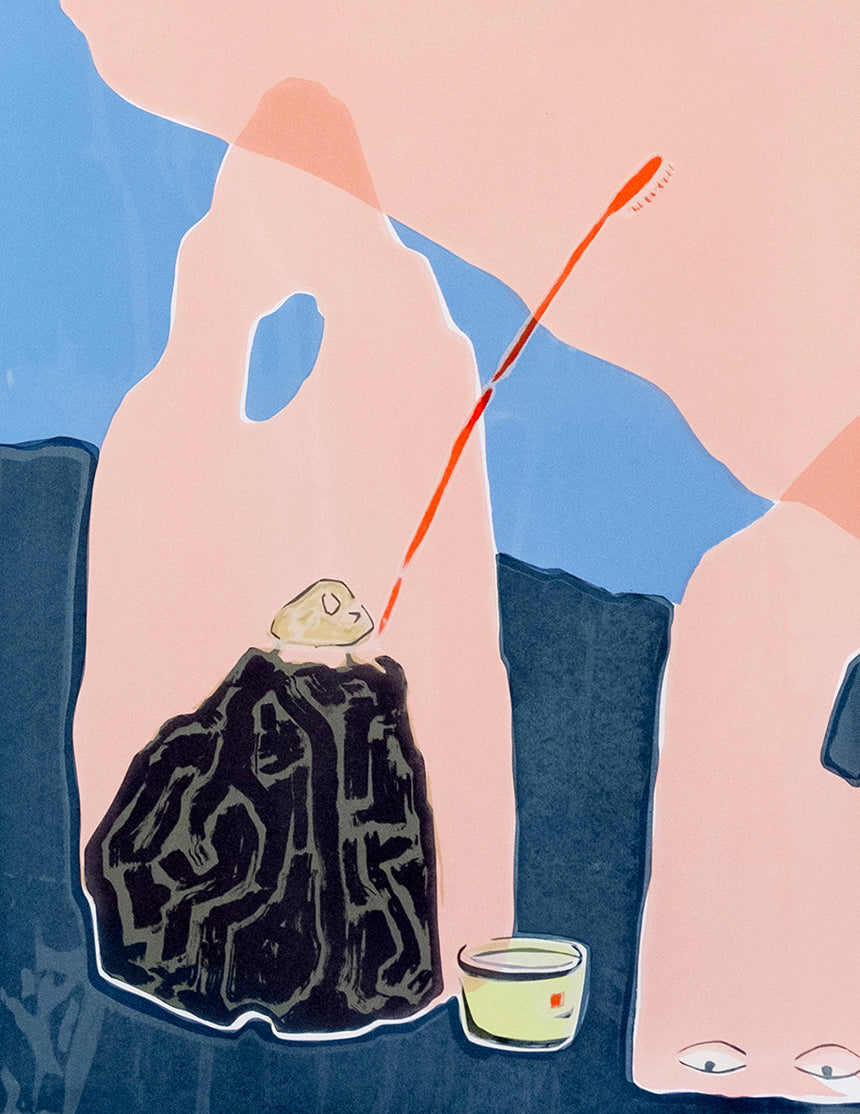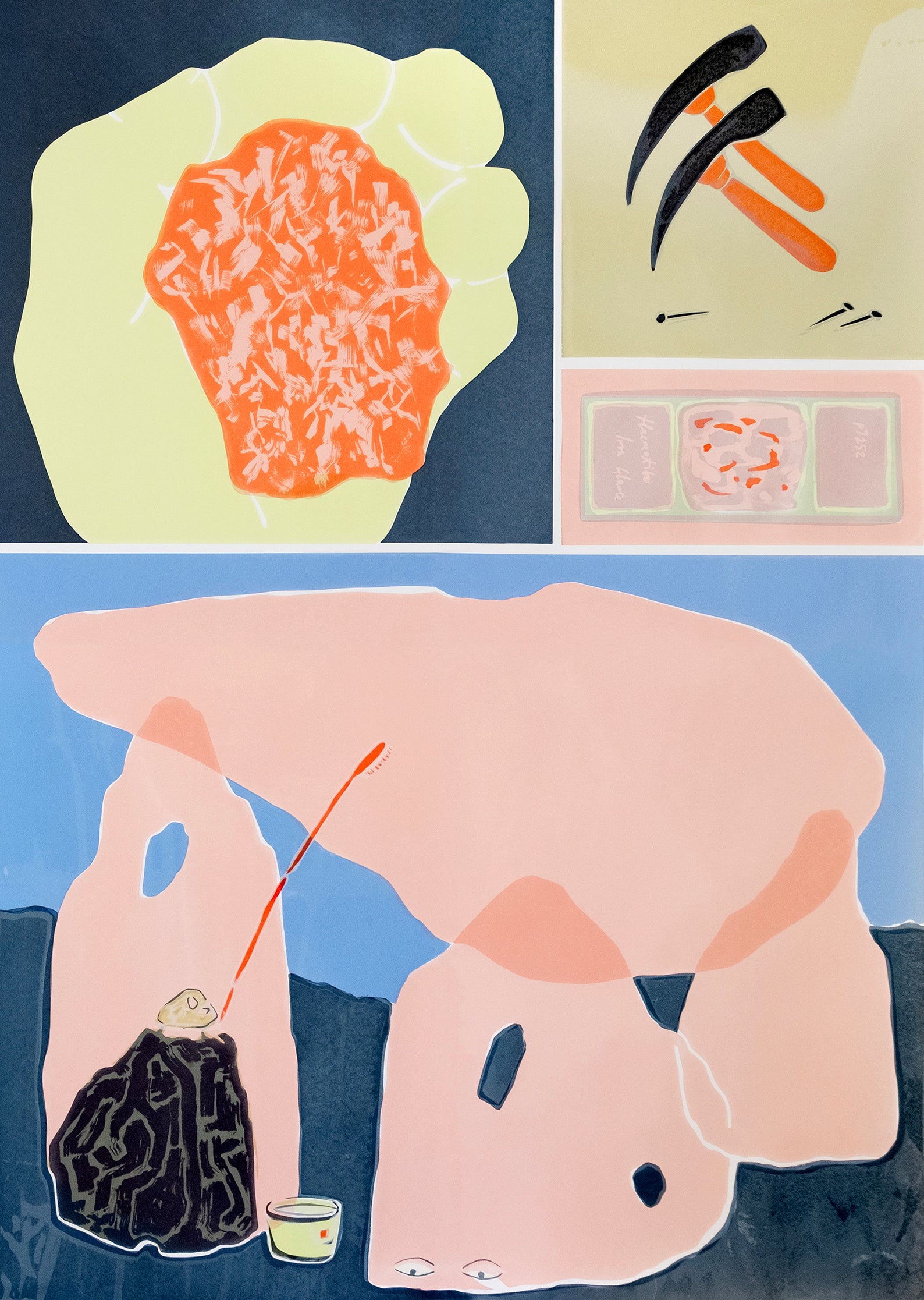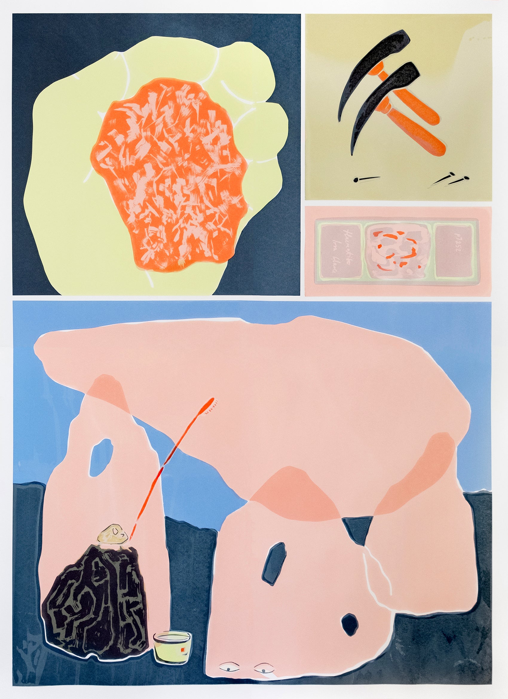 Imagery of rock formations and standing stones appear as recurring motifs in bodies of work spanning screenprinting, documented performance and moving sculptures. In her recent varied edition screenprint series, speculative landscapes are depicted within which workers clean and maintain stone monuments or broken rock-like fragments. Through these works, she employs visual myth-making to ask how geological materials might be able to shape our notion of home, labour, ecological maintenance, and the passing of time.