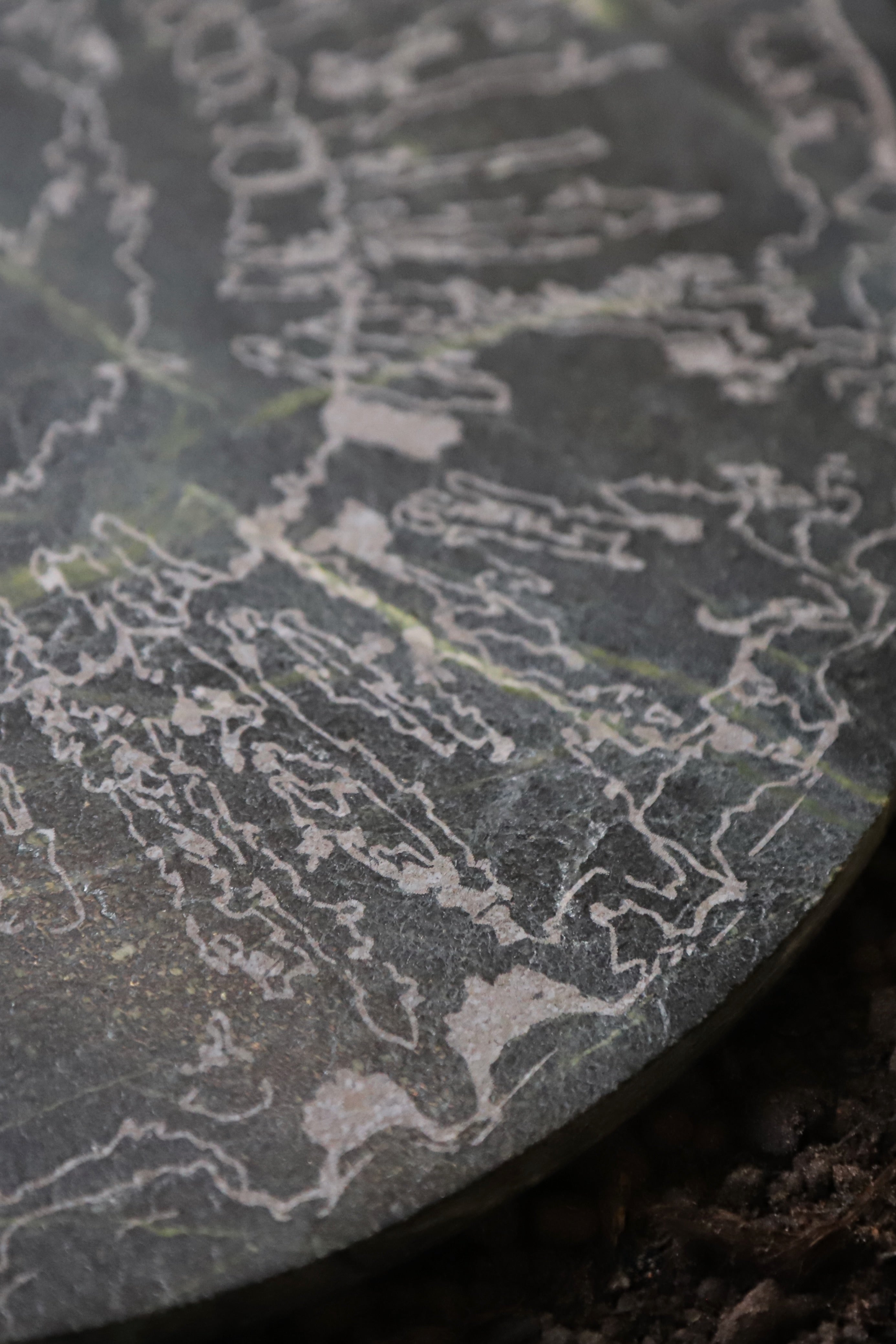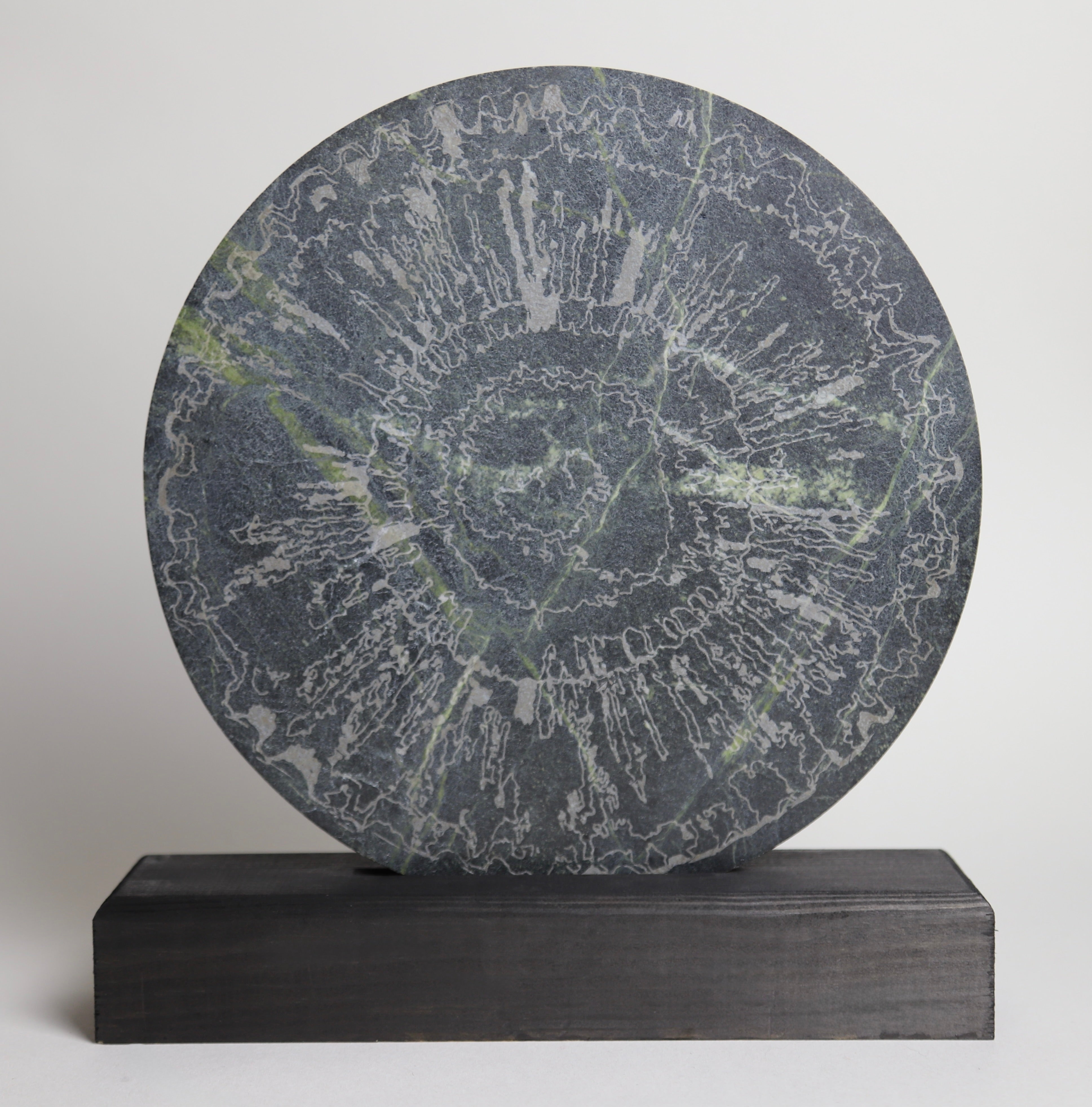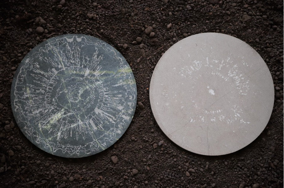 Healthy soil sings, unhealthy soil is silent; taking these two different sound recordings, I created an auditory loop, casting an image resonant of acoustic soil chromatography impressions and etched them both into stone to make a modern fossil record. Just as ancient fossils are silent, these too can only be read by eye and hand. They record our place in time, in this moment of a mass silencing of nature. You can feel the etches of the soil song with your fingers and feel its sound, a memento mori of life before the silence in the noise.