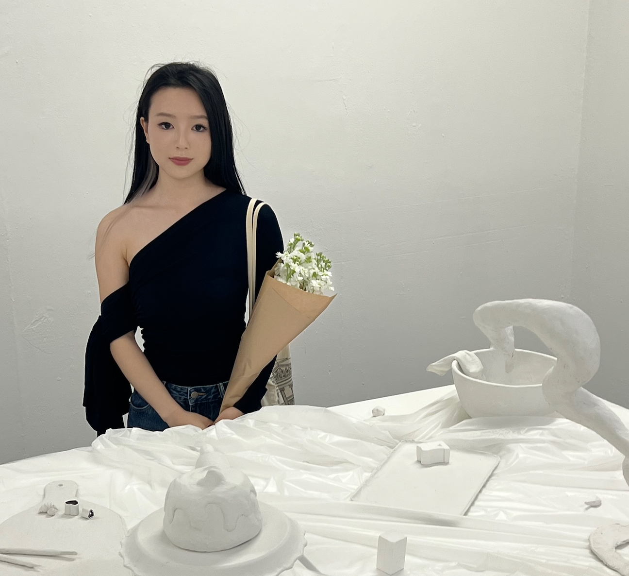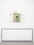 The mirrored cabinet holds the echo of my first memory: consciousness awakening in a bath of endless white light. Its three folding layers fracture and weave reflections like drifting thoughts, while etched portraits whisper of shifting identities and forgotten selves. Beads of glue mimic water droplets, suspending a single moment on glass, inviting the viewer to linger in a timeless hush. Beneath cracked white paint, glimpses of blue hint at the hidden current between the ordinary bathroom and that boundless light — the origin where form, memory, and self dissolve into being.