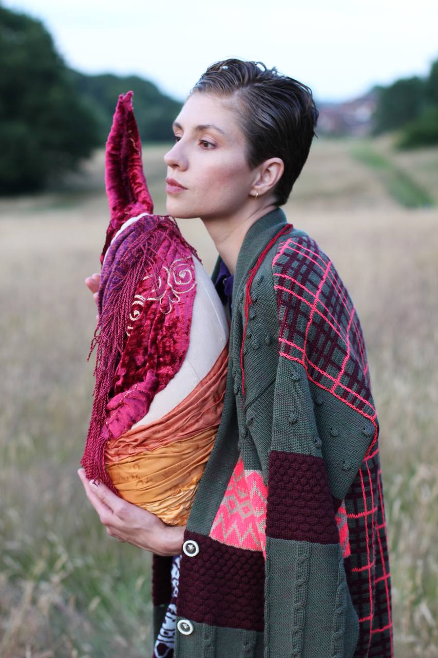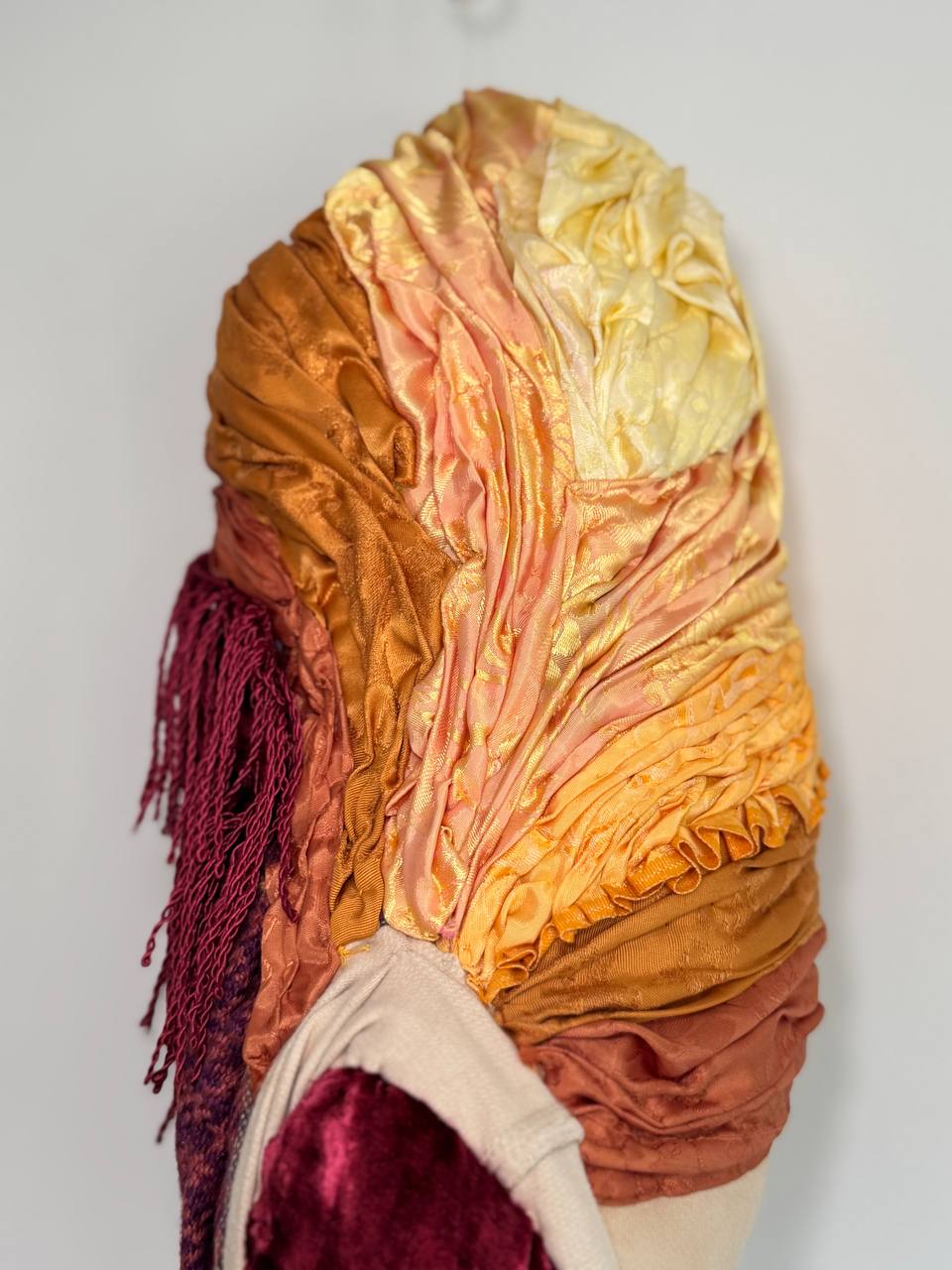Materials: cotton-synthetic (natural dyed), vintage silk, vintage pan velvet. About the work In The Beast, Zulfiya Spowart reinterprets the imagery of Persian miniatures to explore corporeality as a site of internal struggle. Abstract forms evoke battles between order and freedom, reflecting the tension between personal identity and cultural expectations. Clothing, here, becomes a symbol of both societal constraint and individual expression.