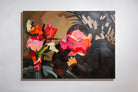 Painting is painted directly on a wood panel with a built in frame. Has been hung onto the wall with screws in the past. Will need wall plugs to hold the weight of the artwork.